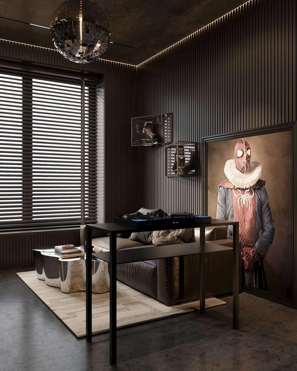 Для усиления эффектов в кабинете использован наливной пол и черный потолок, которые добавляют интерьеру «берложьего» характера, поддерживая общую концепцию. Стены оформлены в графитово-серых матовых оттенках, а полки и декоративные элементы подчеркивают индивидуальность владельца.