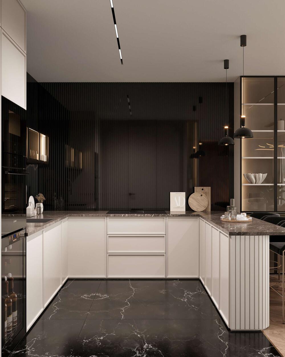 - Черная глянцевая плитка с мраморной текстурой в прихожей и кухонной зоне.