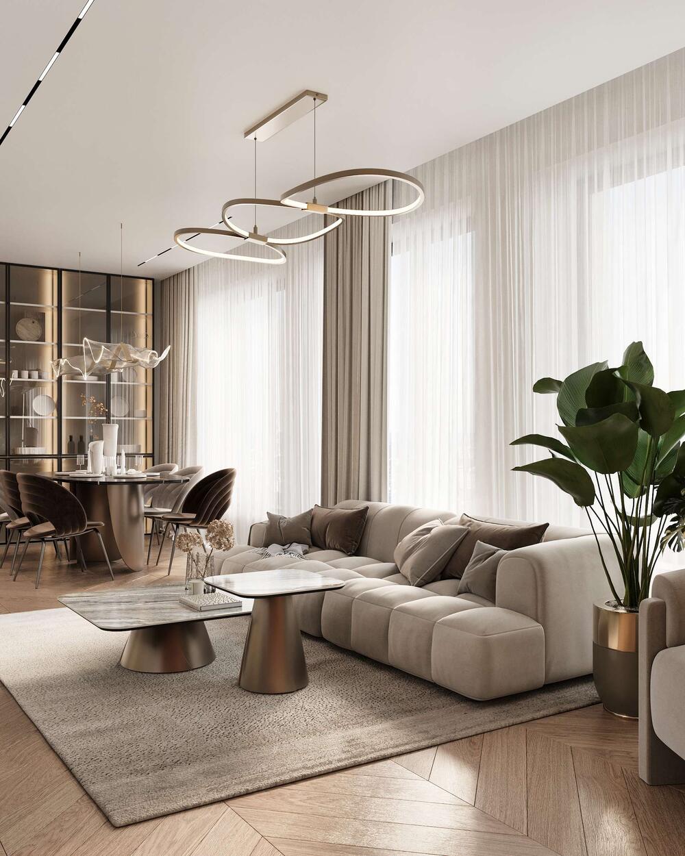 Гостиная оформлена в современном стиле, сочетающем лаконичность и элегантность. Пространство отличается четкими линиями, натуральными материалами и выразительными акцентами. Большой светло-бежевый диван с мягкой текстильной обивкой, идеально подходит для семейного отдыха. Журнальные столики разной высоты с металлическим основанием и каменными столешницами придают современный характер интерьеру.