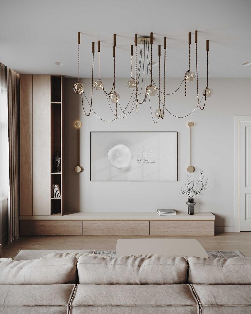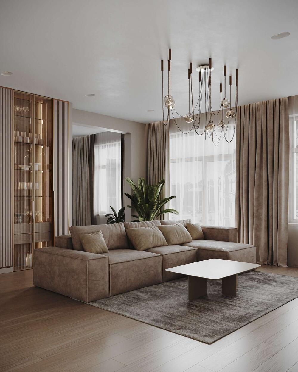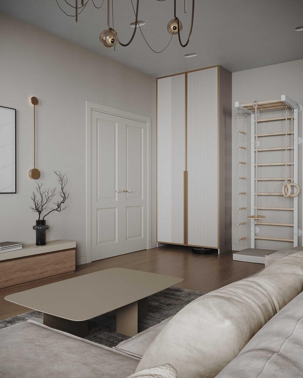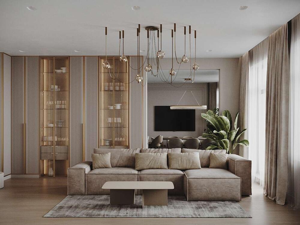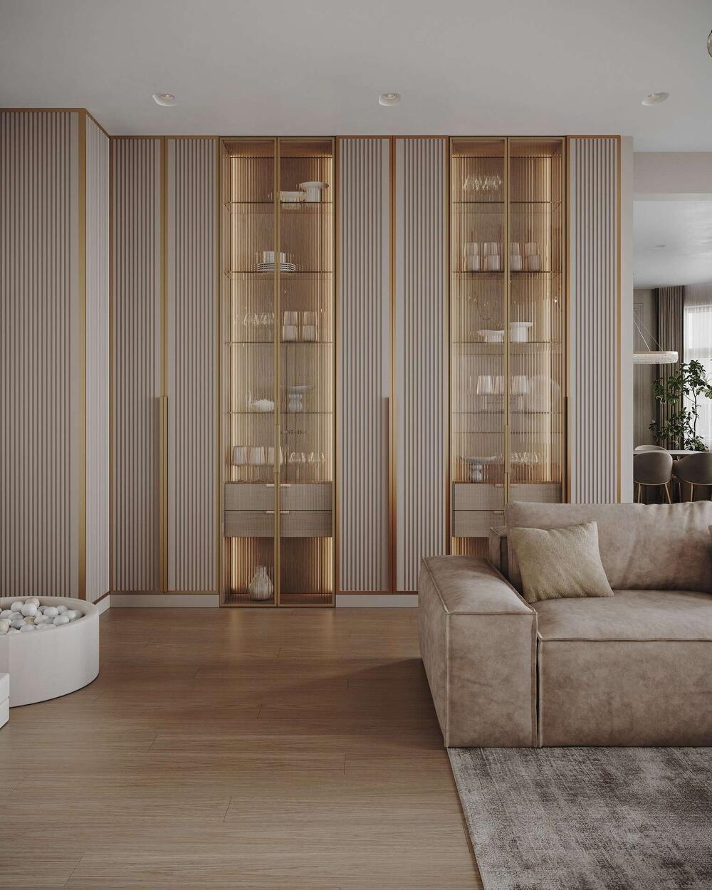 Минималистичный дизайн интерьера квартиры в бежевых оттенках с акцентами латуни в ЖК «Наука» - 109 м²