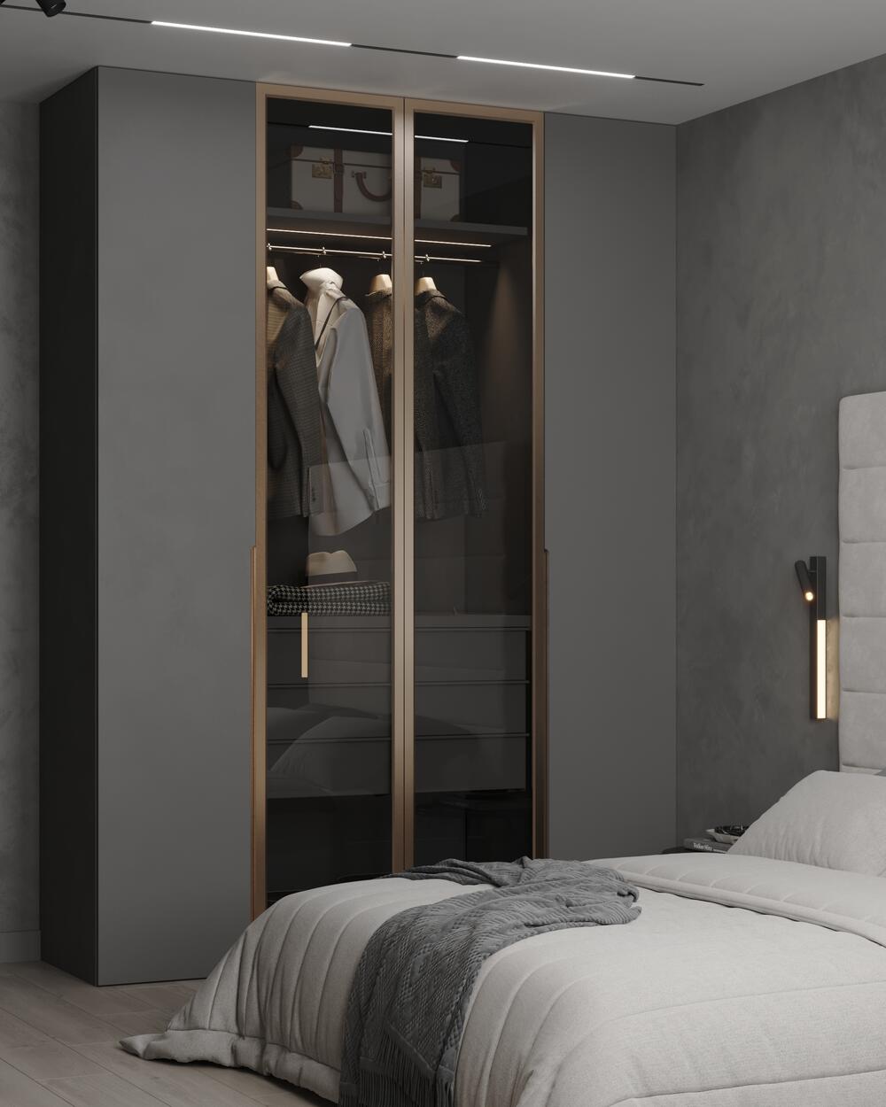 В спальне мы сделали акцент на спокойствии и гармонии. Главный элемент комнаты — кровать с высоким мягким изголовьем. Она не только выглядит эффектно, но и добавляет ощущение защищённости, делает сон комфортнее. Встроенный шкаф до потолка с подсветкой внутри заменил громоздкие системы хранения: всё необходимое легко помещается внутри, при этом комната выглядит просторнее и аккуратнее.