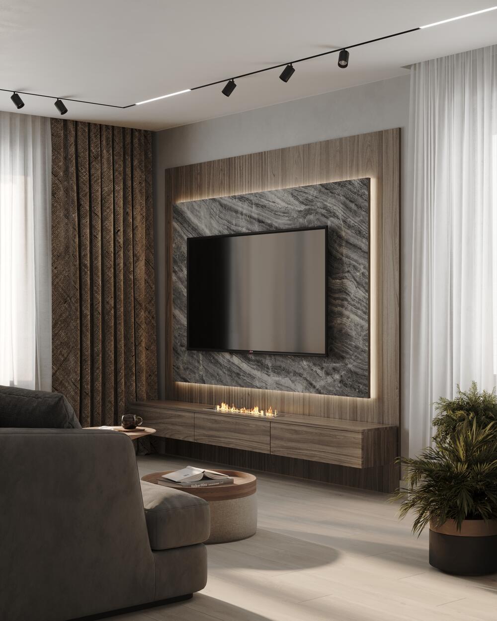 ТВ-зона в гостиной — мы усложнили её композицию: керамогранит с выразительной текстурой, паровой камин и продуманная подсветка формируют эффектный центр притяжения, который делает пространство особенным.