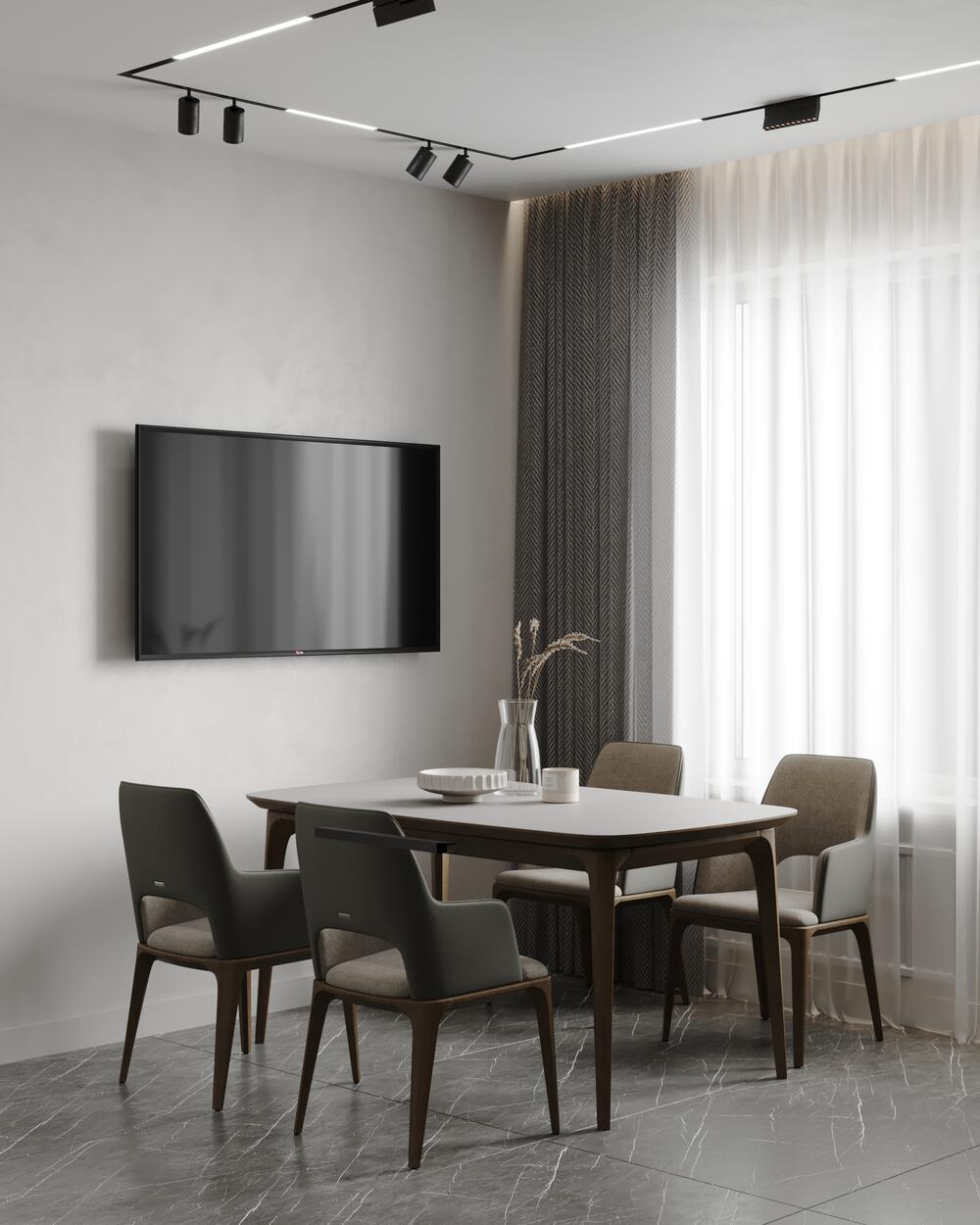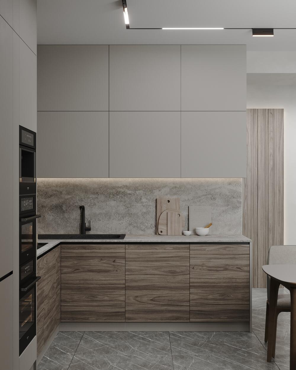 Дерево и шпонированные панели — использованы в мебели и стеновых акцентах, создают визуальную целостность и добавляют естественности.