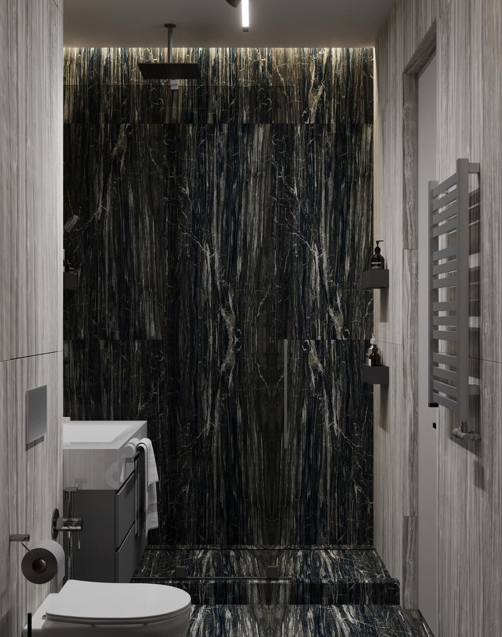 В отделке мы использовали керамогранит в тёплой гамме с тёмными акцентами. Натуральная фактура материала смотрится дорого и долговечно, а мягкая подсветка подчёркивает текстуры и создаёт ощущение спа-зоны.