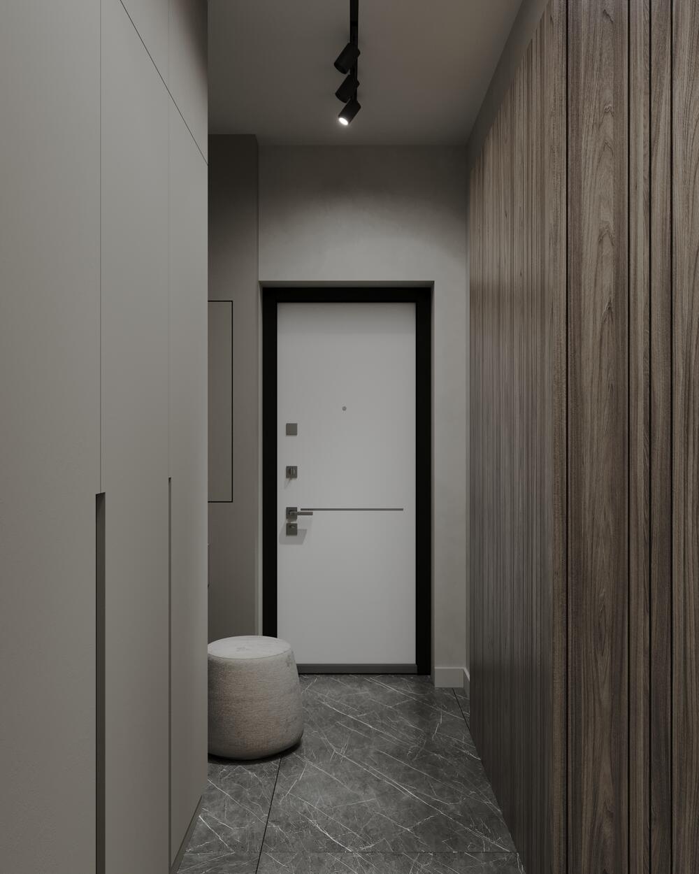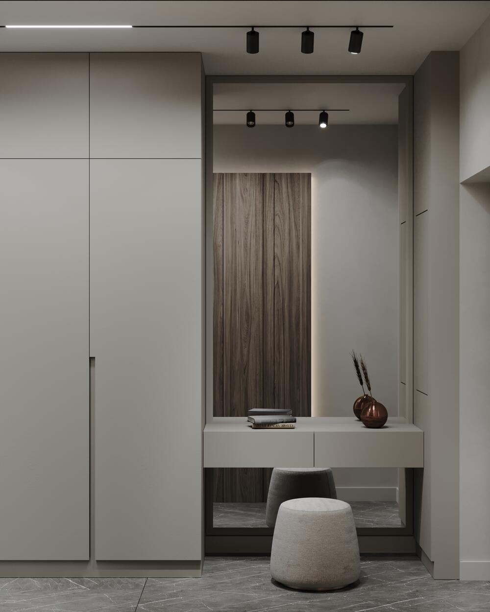 Встроенный шкаф позволяет хранить верхнюю одежду и обувь, не перегружая интерьер. Благодаря этому прихожая остаётся свободной, без лишних деталей, но при этом полностью выполняет свою задачу.