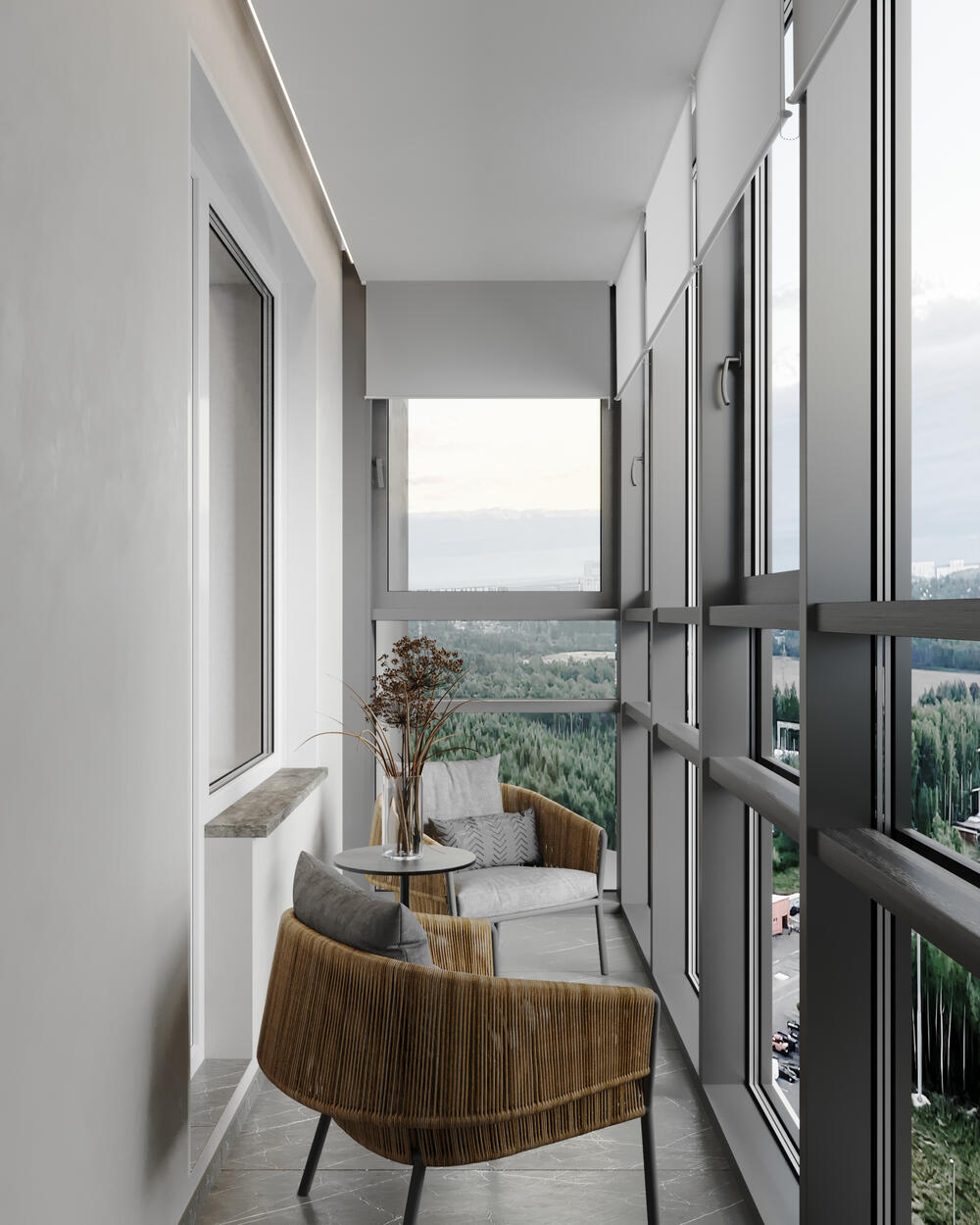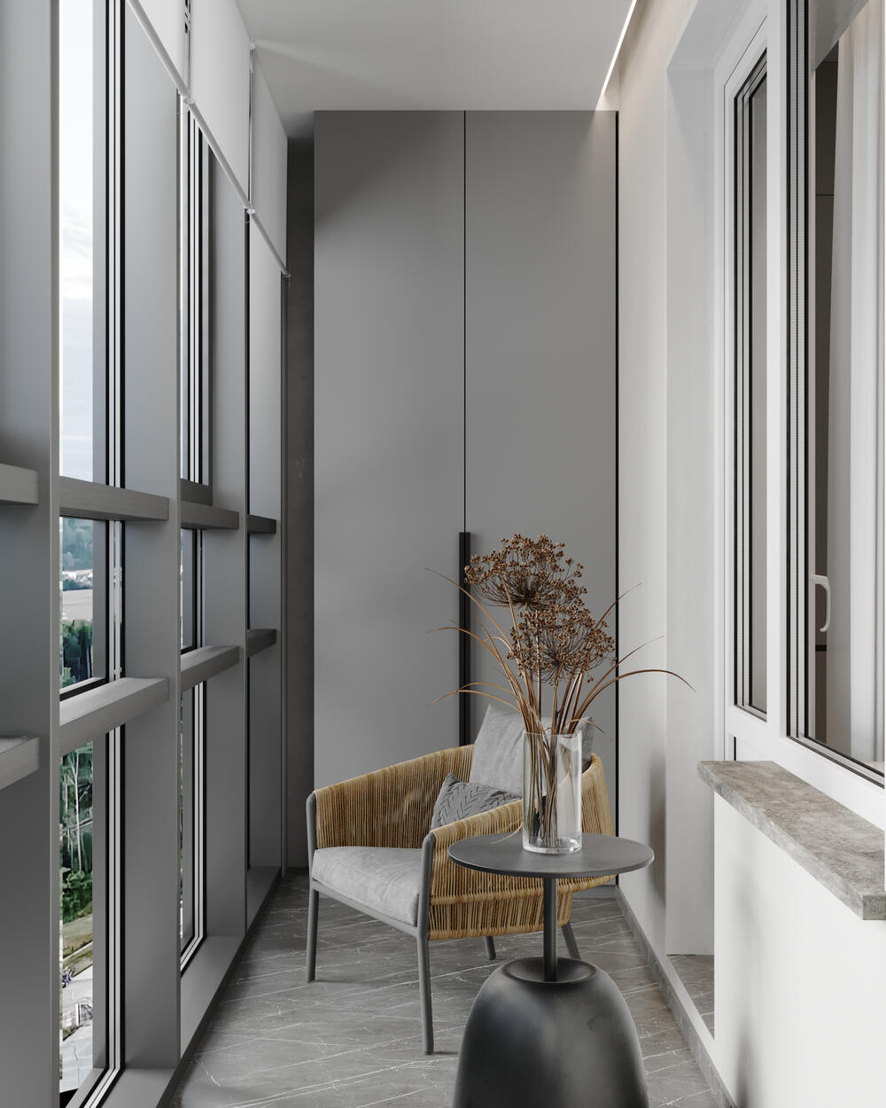 Пространство лоджии мы сделали камерным уголком для отдыха. Удобное кресло, столик и шкаф для хранения создают компактную и функциональную зону. Панорамное остекление усиливает ощущение простора.