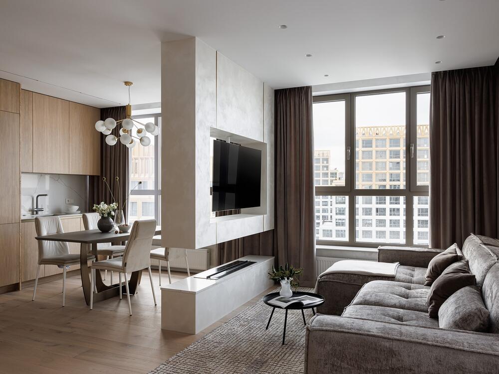 Поворотный ТВ и паровой камин в подвесной перегородке. ТВ можно повернуть туда, где вы находитесь — на кухне или в гостиной. Камин добавляет уюта и делает зону отдыха особенной.