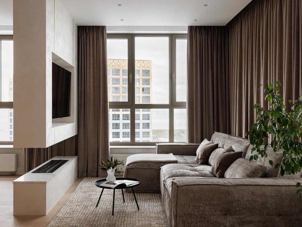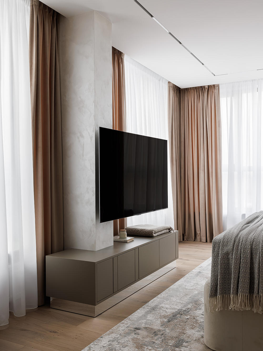 В интерьере — спокойные натуральные цвета: тёплые оттенки бежевого и коричневого, мягкие ткани, дерево. Всё выглядит цельно и спокойно. За счёт больших окон в комнате много света днём, а плотные шторы позволяют полностью затемнить пространство — например, чтобы устроить домашний кинотеатр.