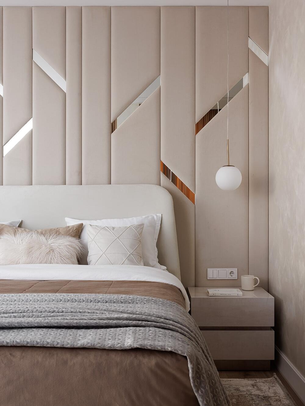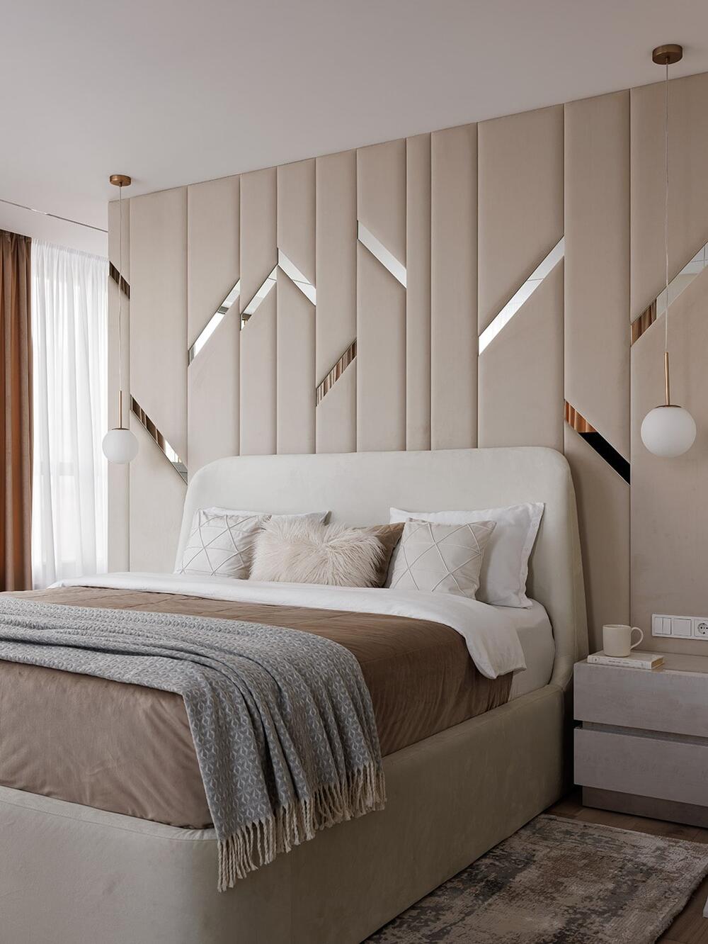 Главный акцент — стена за изголовьем. Её оформили объёмными вертикальными панелями с зеркальными вставками. За счёт такой геометрии интерьер смотрится интересно и современно, а зеркала визуально делают пространство выше и светлее.