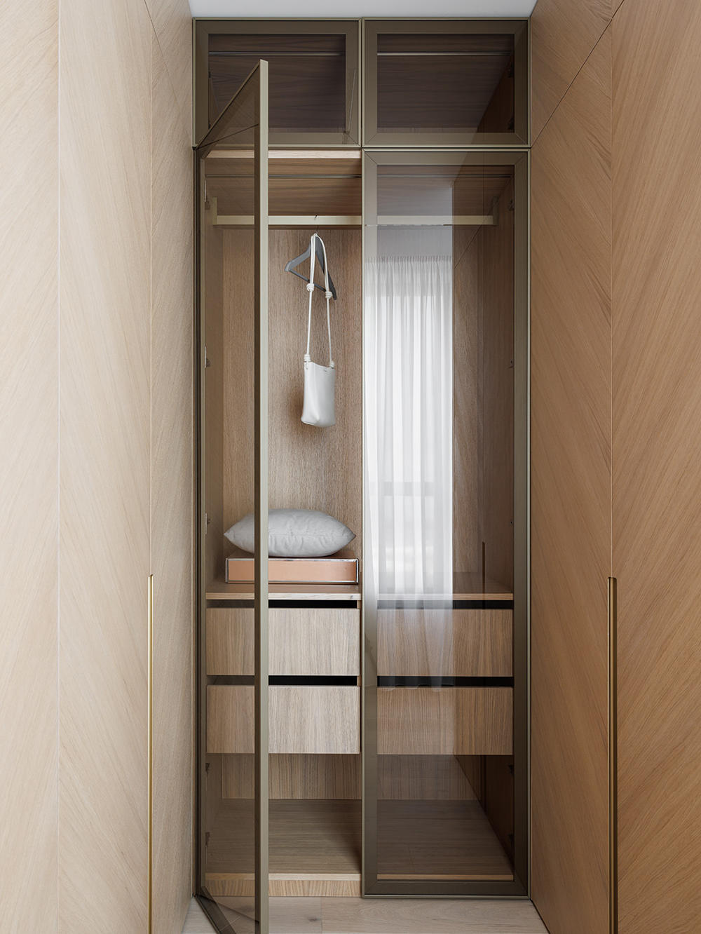 Заказчики просили, чтобы в квартире было как можно меньше мебели и визуального шума. В прихожей это особенно чувствуется: всё оформлено просто, но со вкусом. Вместо открытых вешалок — встроенный шкаф до потолка, который аккуратно прячет всё, что нужно. Фасады — матовые, с лаконичными ручками под латунь, в тон основным акцентам интерьера.