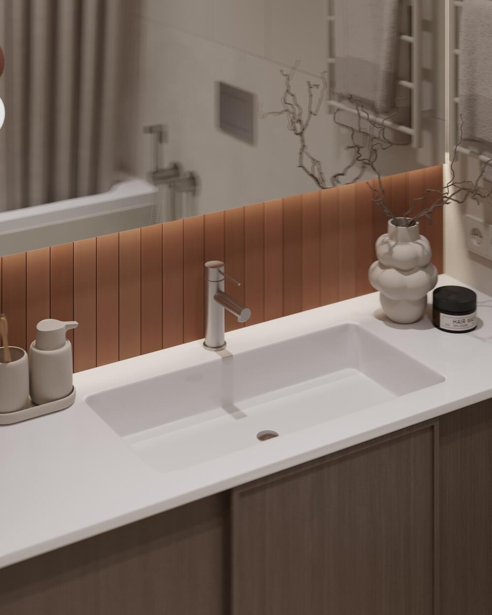 Цвета выбраны в единой гамме с остальной квартирой — тёплое дерево и светлые стены, благодаря чему пространство выглядит цельным и не кажется тесным.