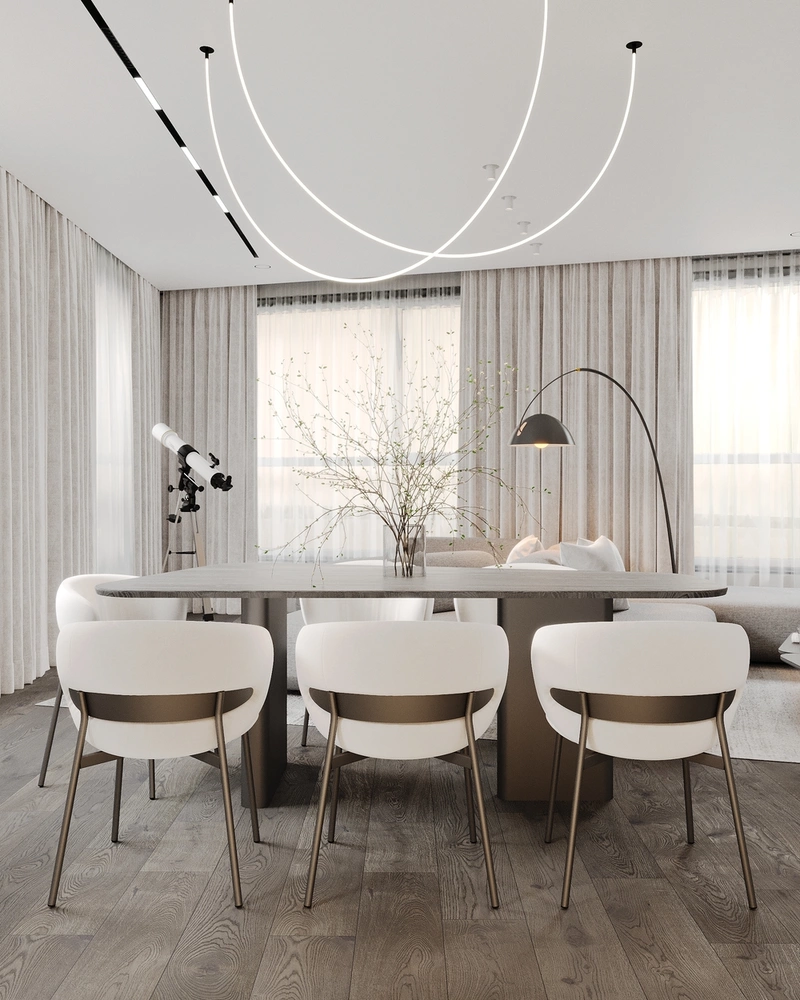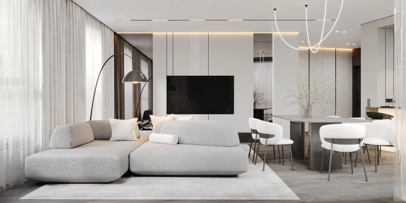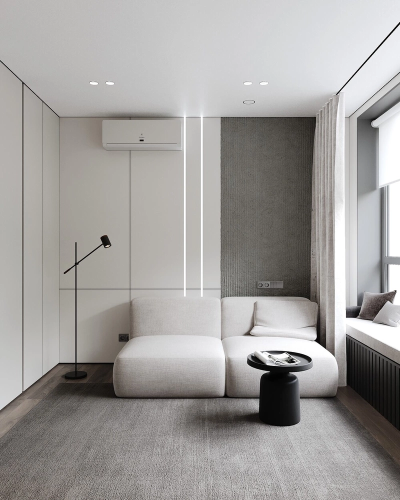 Интерьер выполнен в стиле монохромный минимализм — чистые линии, продуманная геометрия и внимание к каждой детали.