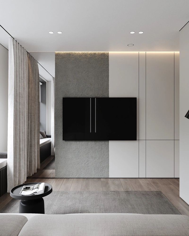Телевизионная зона оформлена минималистично: крупный экран на ровной стене без тумбы и лишнего декора. Все коммуникации и провода скрыты, что поддерживает ощущение чистоты и порядка.
