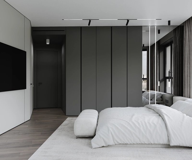 Между кроватью и стенами предусмотрены комфортные проходы, прикроватные тумбы встроены в линию изголовья и не выбиваются из общей геометрии. Низкая кровать и отсутствие визуального перегруза делают пространство безопасным и лёгким в восприятии.