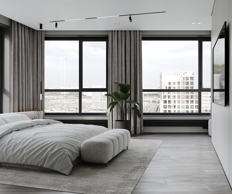 Здесь мы сделали ставку на пространство и свет — благодаря панорамным окнам и мягким нейтральным оттенкам комната выглядит особенно лёгкой.