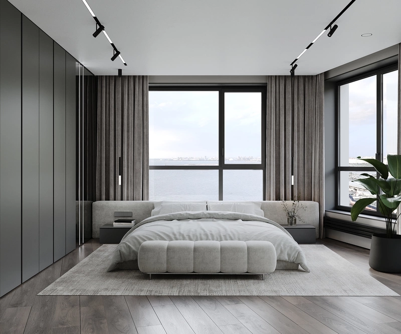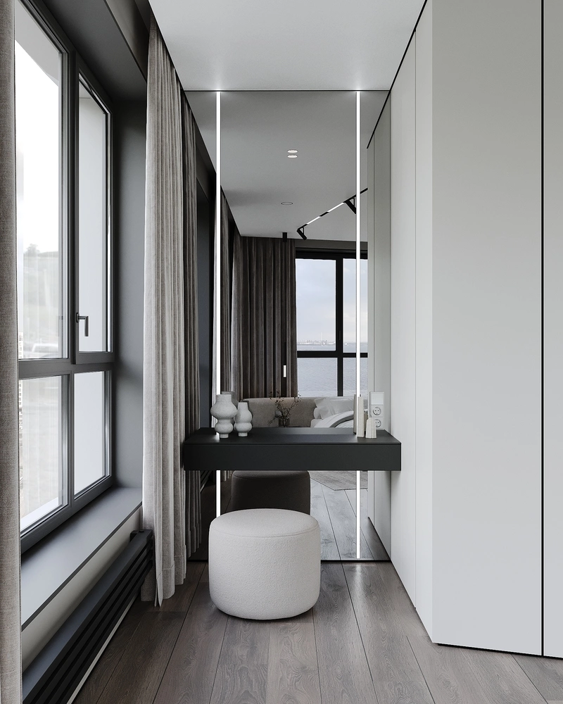 Планировка строится вокруг панорамных окон — кровать ориентирована так, чтобы первым делом открывался вид на Финский залив. Это не просто эстетика, а практичное решение: естественный свет мягко заливает комнату утром, а вечером городские огни становятся частью интерьера.