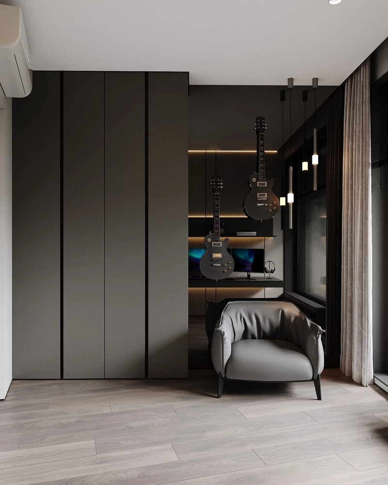 На стене — гитары заказчика, которые стали не только частью декора, но и отражением его хобби. Мягкое кресло у окна создаёт уютный уголок для отдыха или коротких пауз между задачами. Из окна открывается вид на Финский залив — взгляд уходит вдаль, и мозг действительно отдыхает.