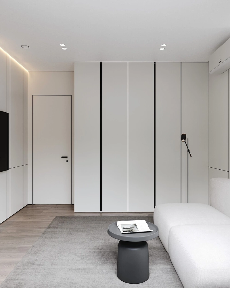 Большой встроенный шкаф выполнен вровень со стеной — он вместительный, но незаметный. Это освобождает место и сохраняет ощущение открытого пространства.