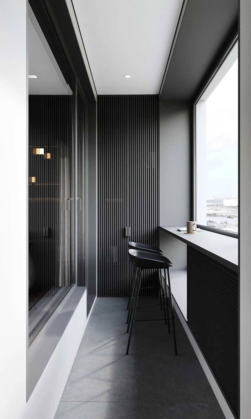 Мы оформили лоджию в едином стиле с кабинетом: тёмные вертикальные рейки, аккуратные панели, скрытые люки-доступы к технике. У окна — высокая барная стойка с парой стульев: можно сделать паузу, выпить кофе и смотреть на залив. Пол — керамогранит, рассчитанный на перепады температур.
