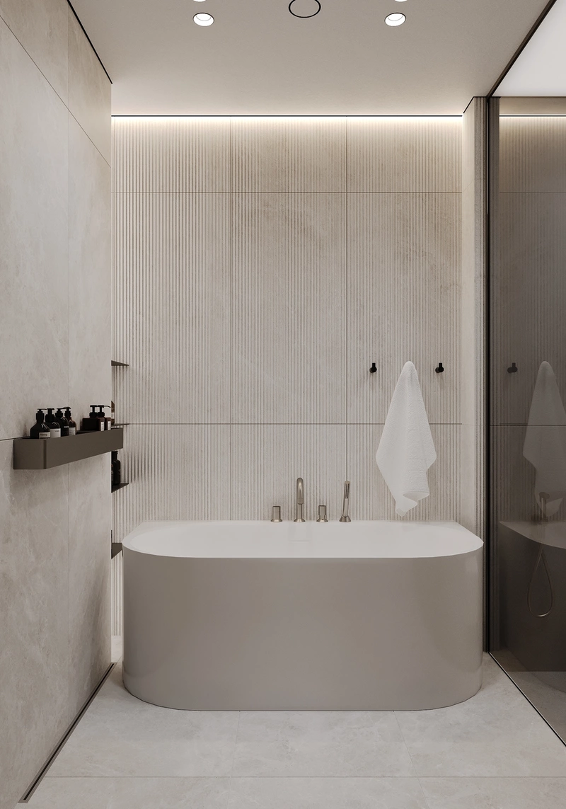 Главная идея — объединить душевую и ванну под одной стеклянной перегородкой. Это решение выглядит легко и современно, а главное — практично: вода не разбрызгивается, при этом остаётся ощущение открытого объёма. Душ оборудован встроенной нишей для косметики, так что все средства — под рукой, но не на виду.