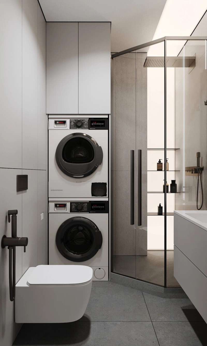 Мы объединили практичность и эстетику: стиральная и сушильная машины установлены в колонну, а сверху — шкаф для хранения бытовой химии, запасов полотенец и других мелочей. Такое решение экономит место и сохраняет визуальный порядок.