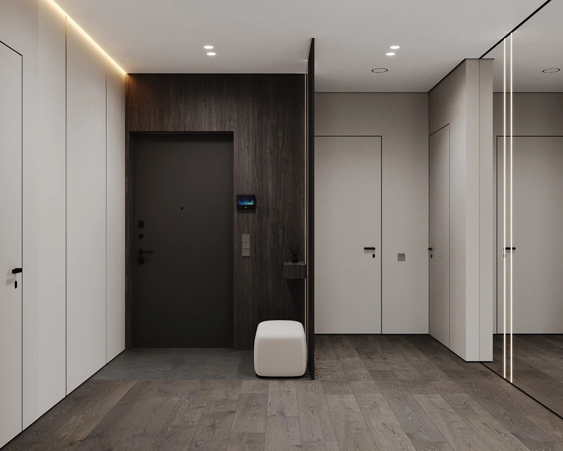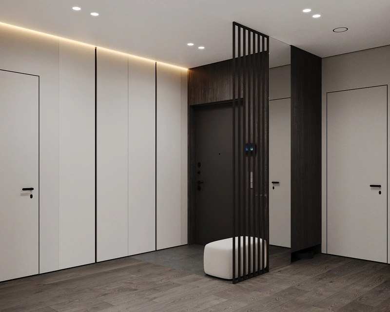 В прихожей организована двухуровневая структура: «грязная» зона у входа и «чистая» — ближе к жилой части. Такое деление позволило разместить оборудование для умного дома и скрыть инженерные элементы без потери эстетики.