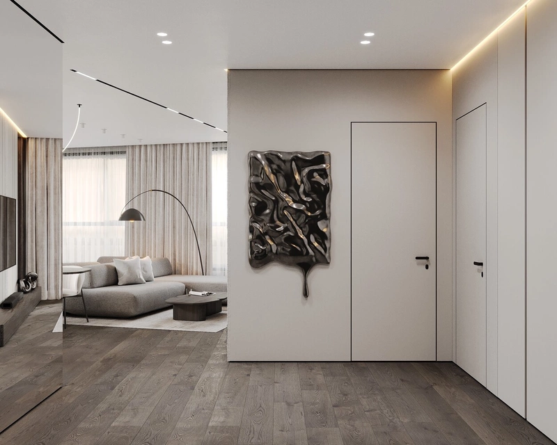 За одной из панелей мы спрятали оборудование умного дома и электрический щит — всё продумано технически, но не бросается в глаза. Такое решение позволяет сохранить идеальную геометрию стен и чистоту линий, что особенно важно в минималистичном интерьере.