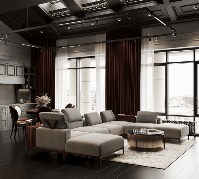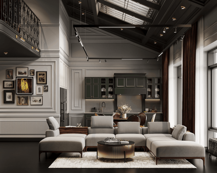 Этот интерьер — про зрелость, сдержанную эстетику и продуманные решения. Здесь нет показной декоративности — только выверенные материалы, чёткая архитектура и логика в каждой детали. Высота, свет, симметрия, натуральные поверхности и глубокие цвета формируют атмосферу уверенности и спокойствия.
