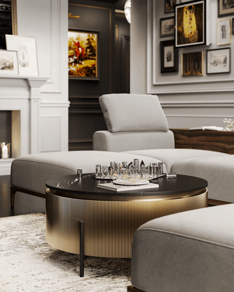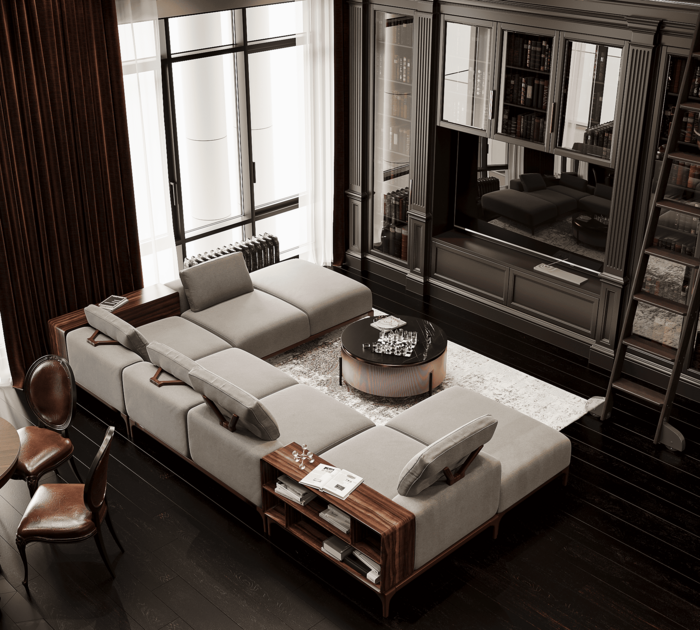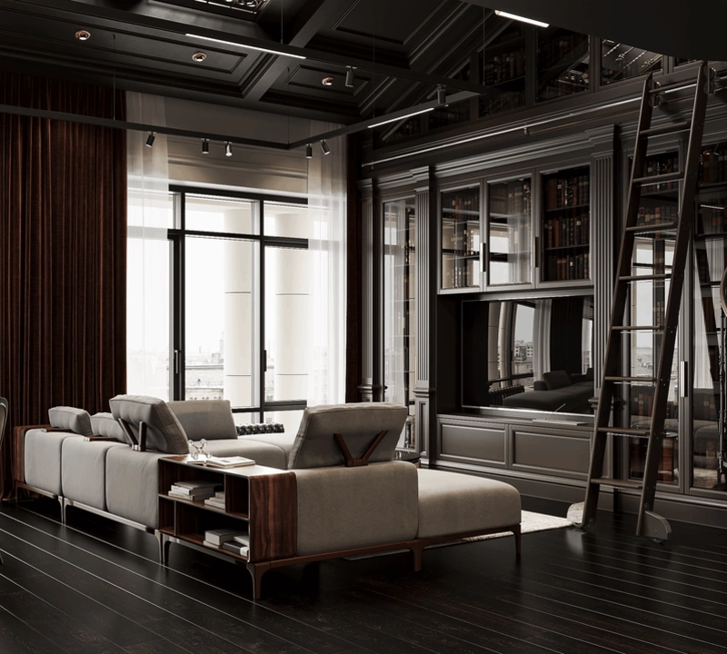 Гостиная объединена с кухней в единое парадное пространство. Центром композиции стал мягкий модульный диван, который разделяет зоны и задаёт ритм. За ним — тёмно-серая библиотека с зеркальными вставками и лестницей, ведущей на антресоль.