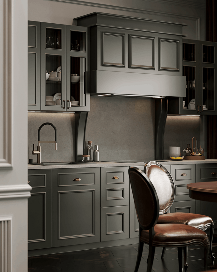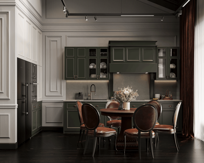 Кухня получилась камерной, выразительной и собранной по классическим канонам — как и хотел заказчик. Фасады глубокого зелёного оттенка, кожаные стулья с заклёпками и акцентный фартук с орнаментом создают атмосферу добротного европейского интерьера. Встроенные шкафы, лаконичная техника и симметричная композиция подчёркивают структуру пространства. При этом кухня остаётся тёплой и живой: здесь хочется не только готовить, но и собираться за столом с близкими.