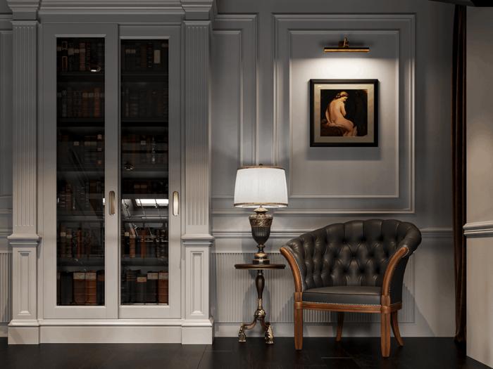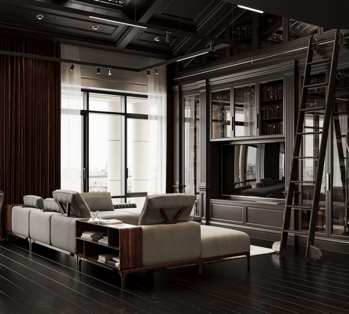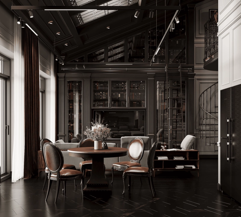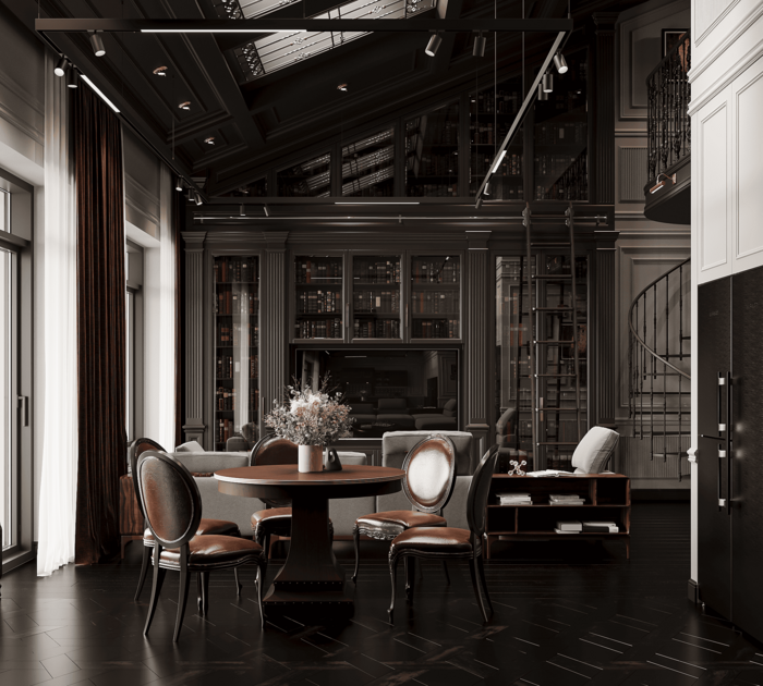 На втором уровне расположена уютная библиотека с креслом и витринными шкафами — она служит местом для уединения и чтения. Благодаря второму свету, пространство наполнено воздухом и контрастно сочетается с тёмным полом, молдингами и плотными портьерами в цвете бордо.