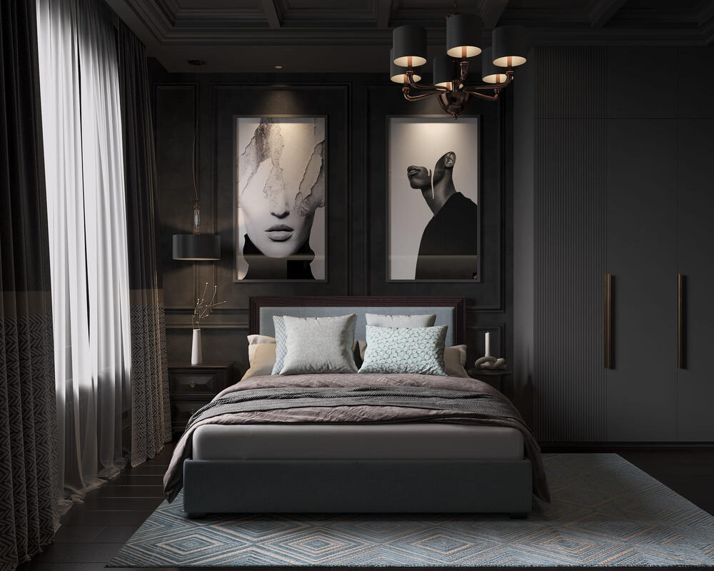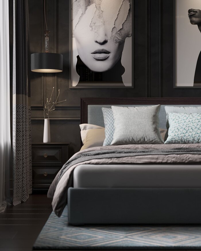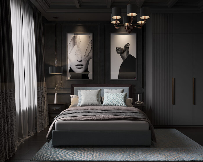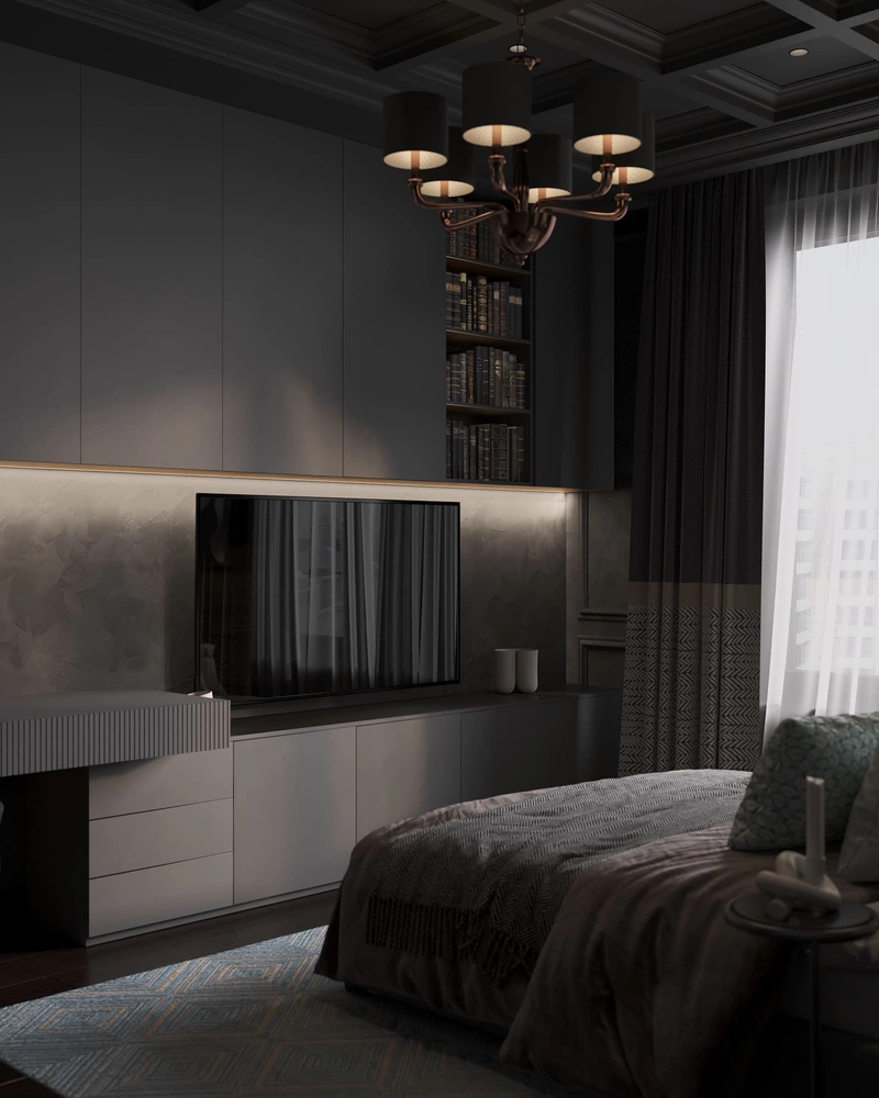 Вторая спальня оформлена в благородной серо-графитовой гамме. Акцентная стена за кроватью декорирована классическими панелями и дополнена современными постерами. В комнате предусмотрено полноценное рабочее место с эргономичным креслом и встроенной системой хранения. Такое решение особенно удобно, если спальня используется как гостевая или личная комната для работы и отдыха.