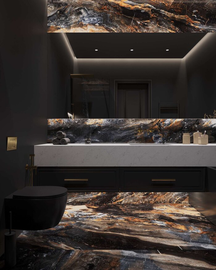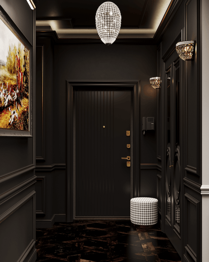 Помещение не перегружено: благодаря тёмной отделке и встроенной подсветке создаётся камерная атмосфера, а грамотная планировка позволяет быстро организовать порядок — даже при активном ритме жизни.