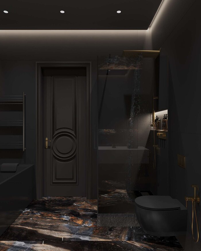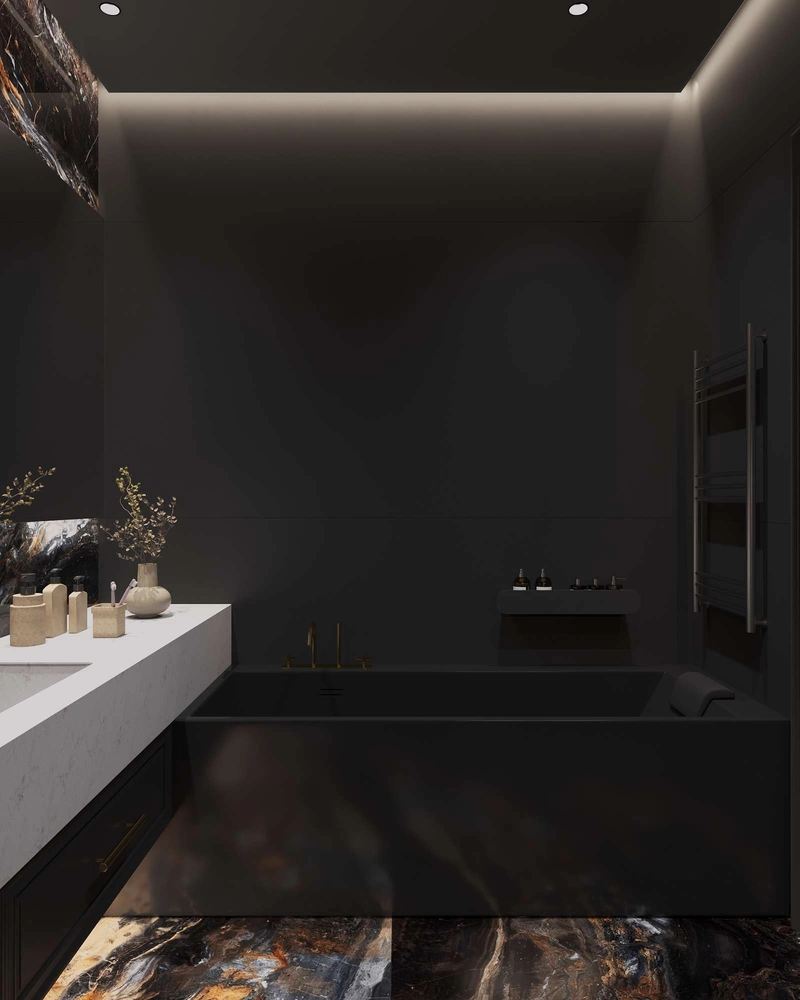 Ванная комната при мастер-спальне оформлена в глубоких тёмных тонах. Главный акцент — матовая ванна, встроенная в нишу, и графичный силуэт пространства.