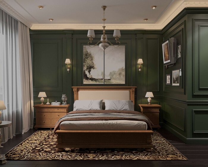 Хозяйская спальня оформлена в благородной зелёной гамме. Стены декорированы классическими панелями, которые подчёркивают высоту потолка и создают ощущение уюта. Центр композиции — кровать с мягким изголовьем и деревянной рамкой. По бокам — симметричные прикроватные тумбы и настенные светильники в бронзовом металле.