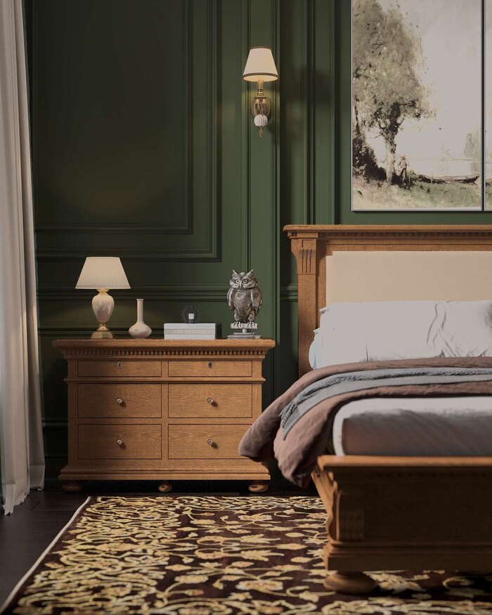 Интерьер собран по канонам английской классики: плотный текстиль, ковёр с орнаментом, сдержанная палитра и продуманное освещение. Шкафы встроены в нишу, не загромождают пространство и визуально сливаются со стенами. Это спальня для отдыха, где всё говорит о стабильности, вкусе и характере.