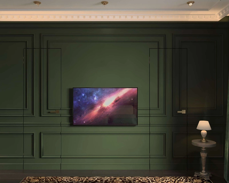 Интерьер выполнен в строгом классическом стиле без орнаментов — с акцентом на симметрию, глубокие цвета и натуральные материалы. В качестве базовых использованы тёмные древесные оттенки, графит, насыщенный зелёный и сложные серые полутона. Акценты добавляют латунь, тёмный камень, бархат и зеркальные вставки. Общая палитра выдержана и благородна — она подчёркивает архитектуру пространства и характер заказчика.