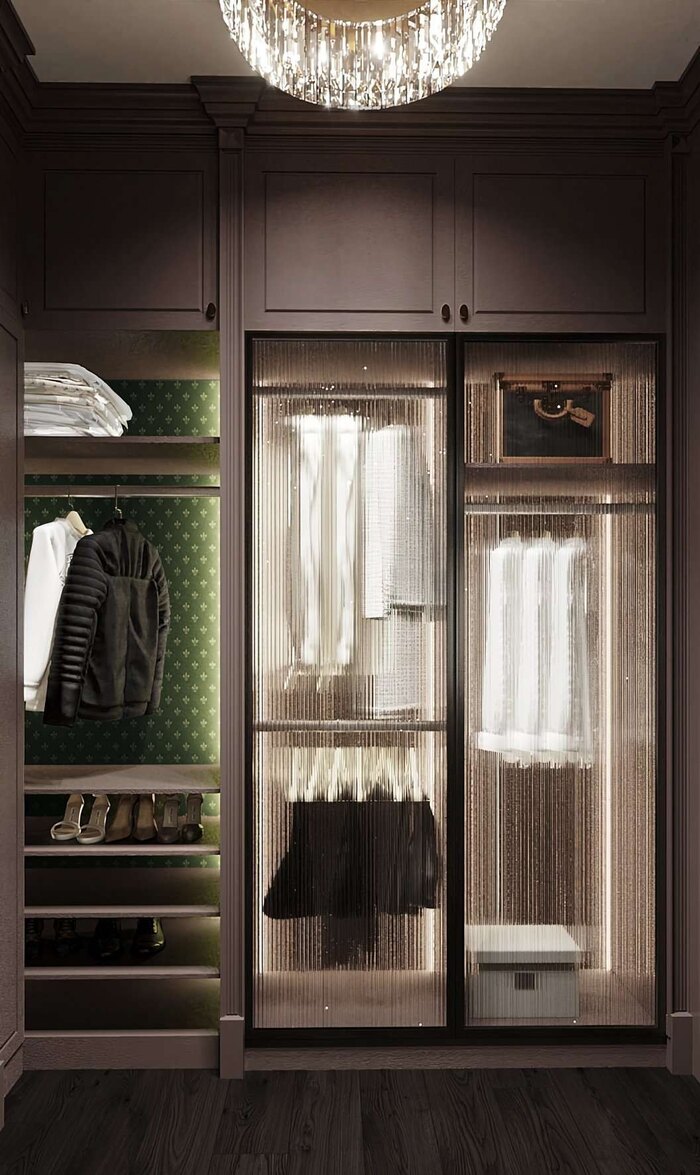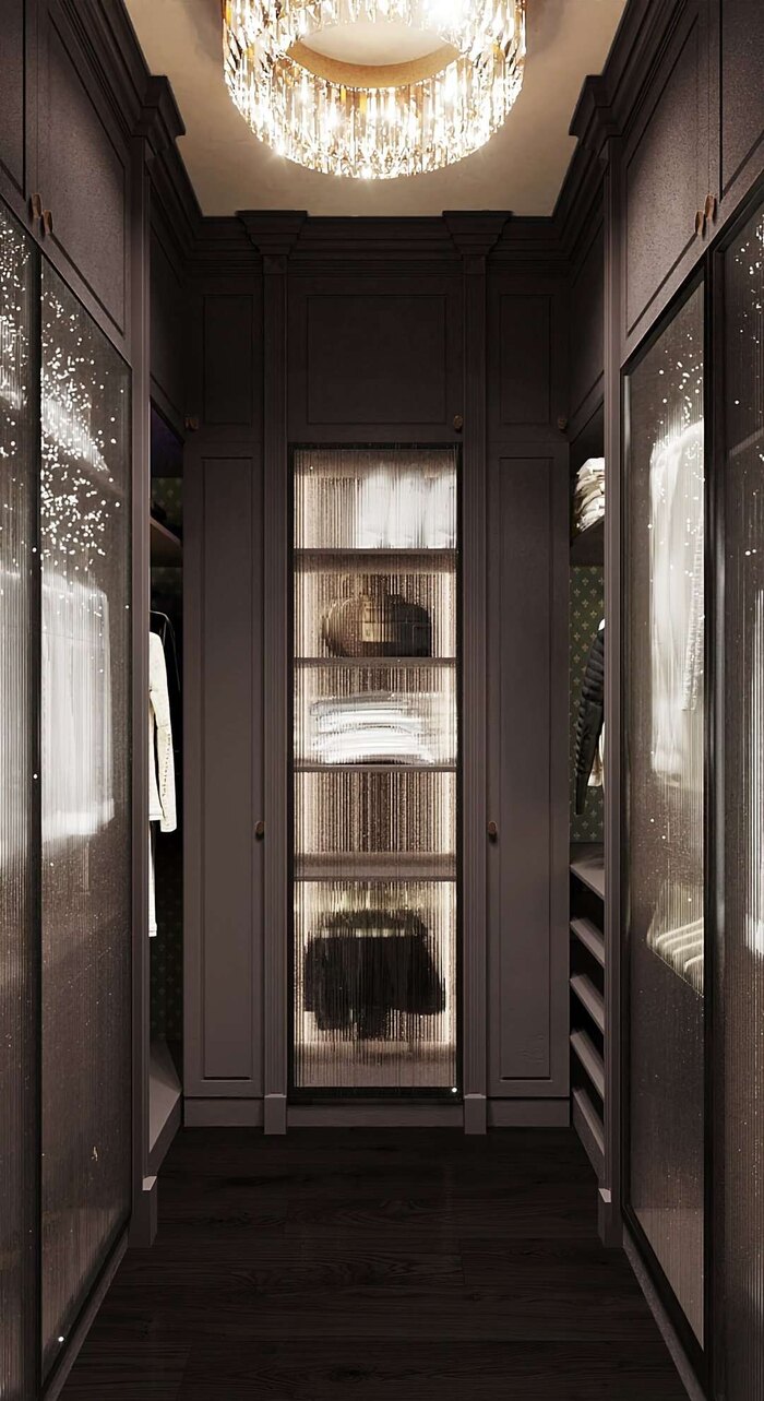 Шкафы с рифлёными стеклянными фасадами и внутренней подсветкой создают ощущение порядка и лёгкости. Цветовая гамма выдержана в той же темной палитре, что и спальня, что поддерживает единый стиль.