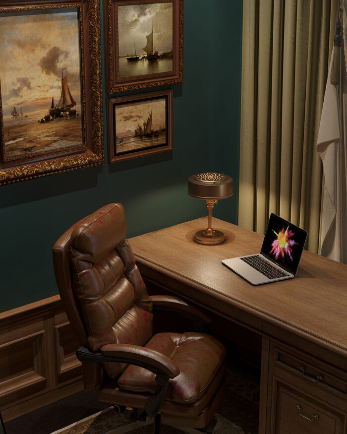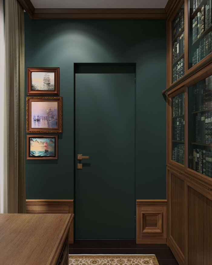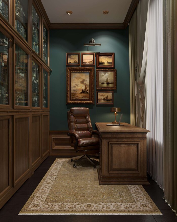 Кабинет оформлен в классической традиции: зелёные стены, деревянная мебель с резным декором, ковёр с орнаментом и коллекция картин в винтажных рамах. По одной из стен — библиотека с остеклёнными фасадами.
