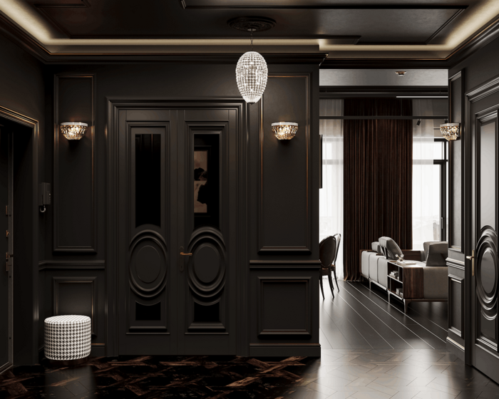 Сочетание тёмных классических форм с современными материалами. Проект демонстрирует, как строгая классика может быть современной. Натуральный паркет, массив дерева, кварцвиниловая плитка в тёплых оттенках, гладкая штукатурка, латунь и бархат создают богатую, но не вычурную среду. Всё тактильно, сдержанно и визуально дорого.