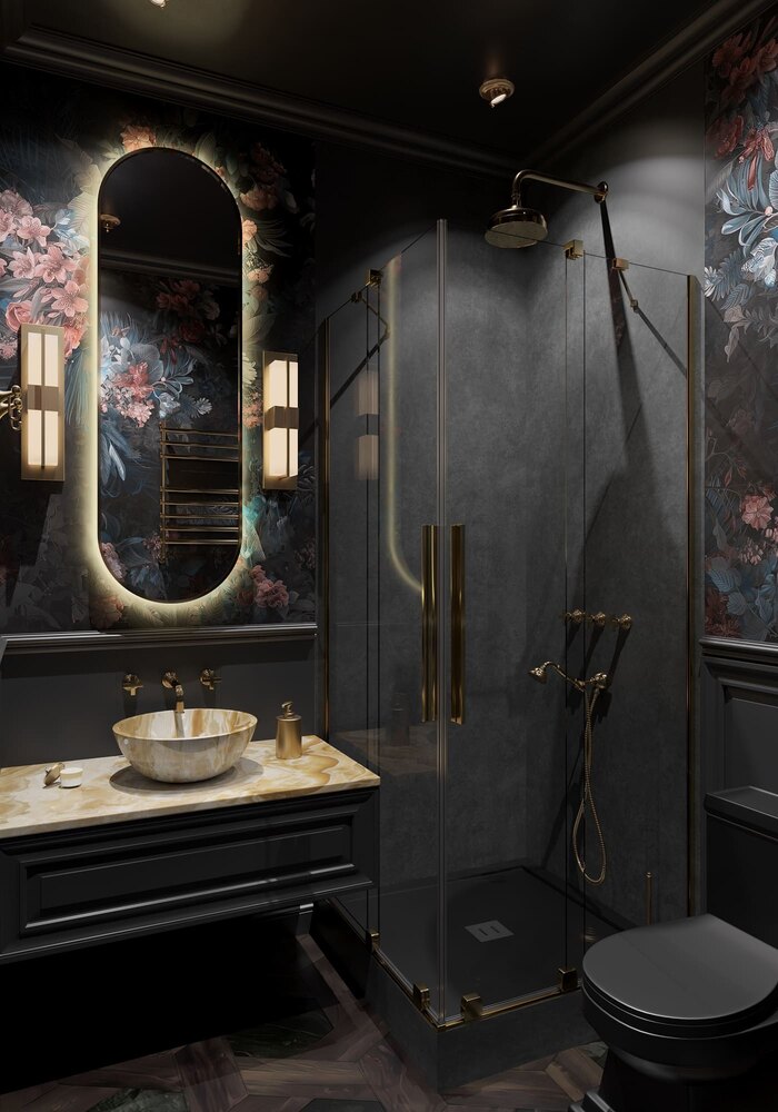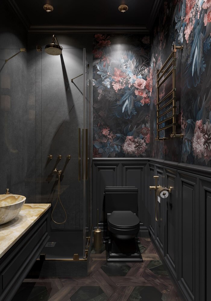 Интерьер оформлен с выразительным акцентом: тёмные классические панели сочетаются с насыщенными цветочными обоями. Такое оформление создаёт ощущение уюта и подчёркивает декоративный характер пространства.