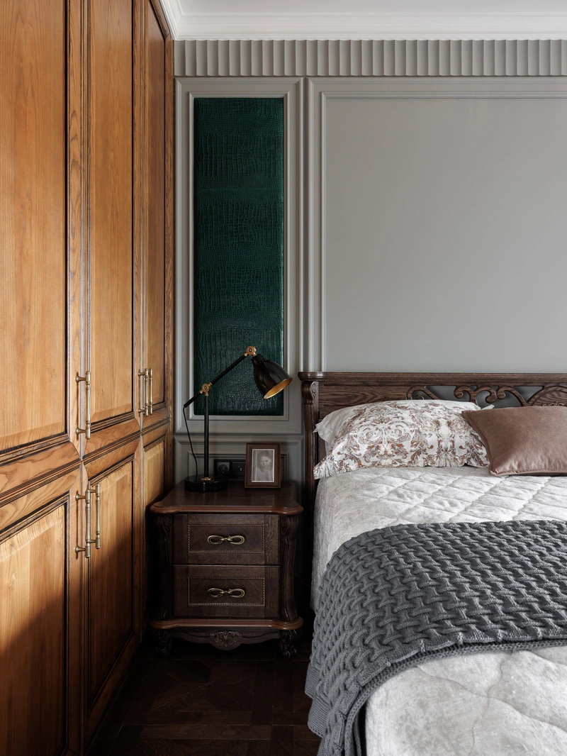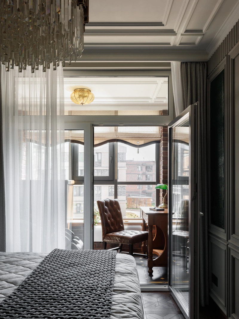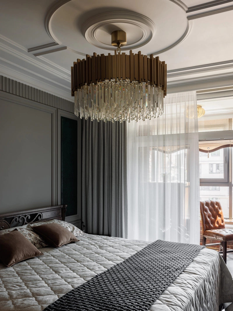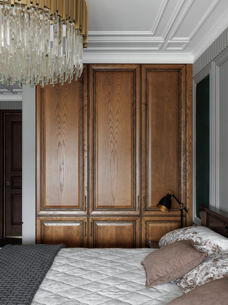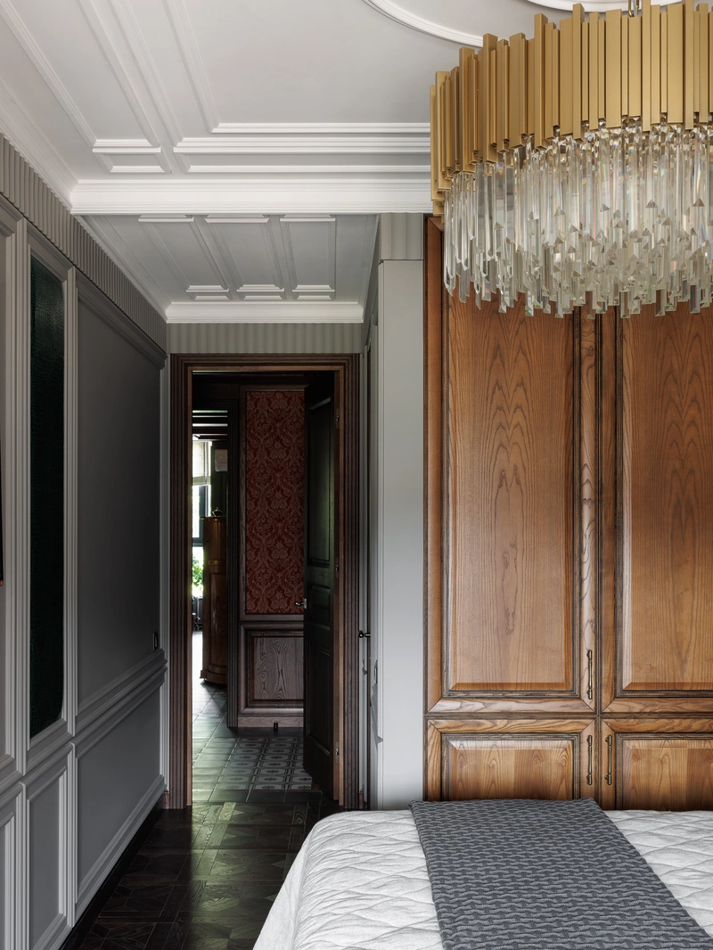 Спальня решена лаконично и сдержанно. Центральное место занимает массивная кровать, стены оформлены молдингами и спокойными серыми оттенками. Большая люстра с хрустальными элементами добавляет торжественности. Благодаря переносу дверей удалось сделать вход в мастер-санузел прямо из спальни, что повысило удобство и приватность зоны.