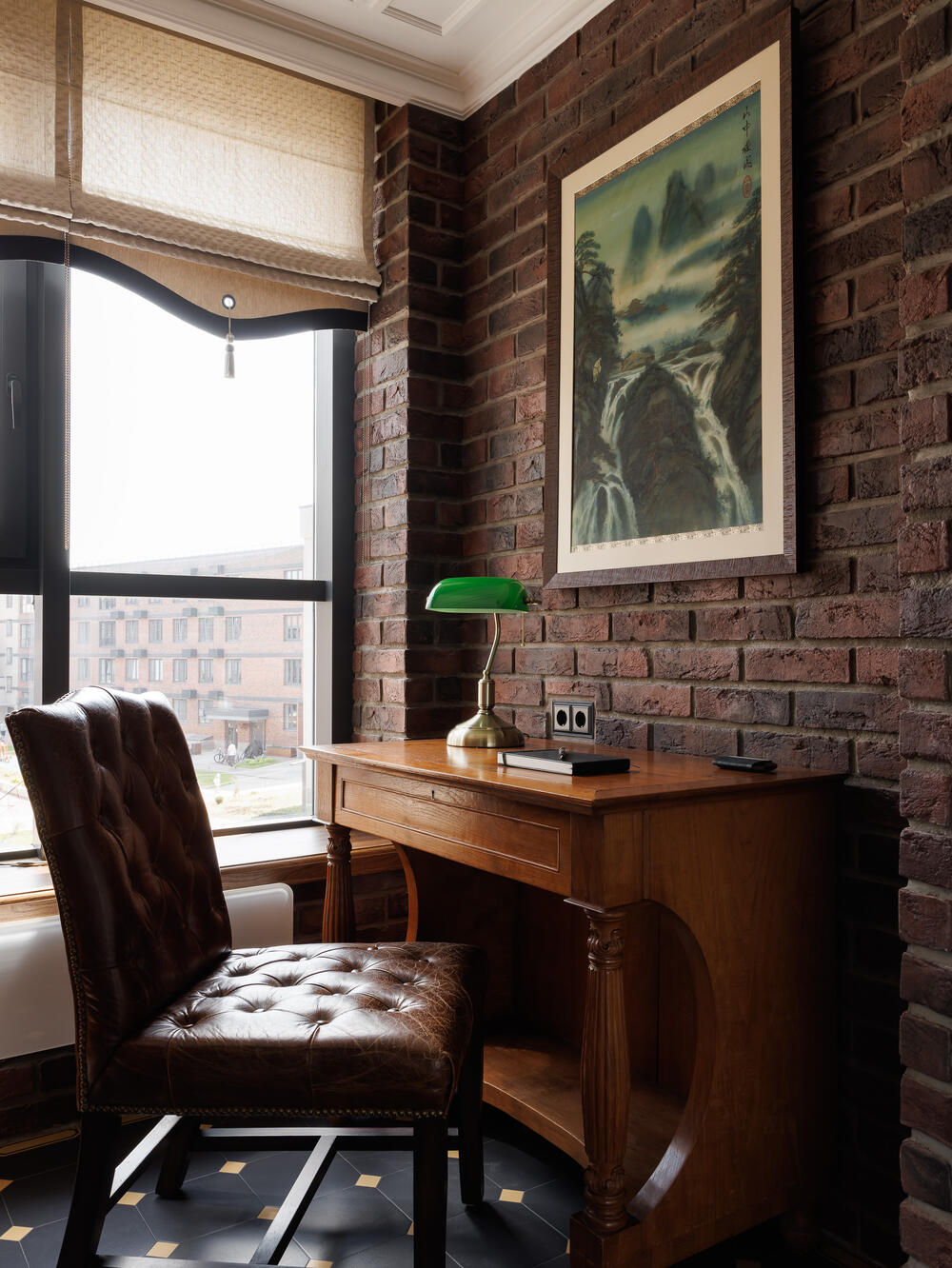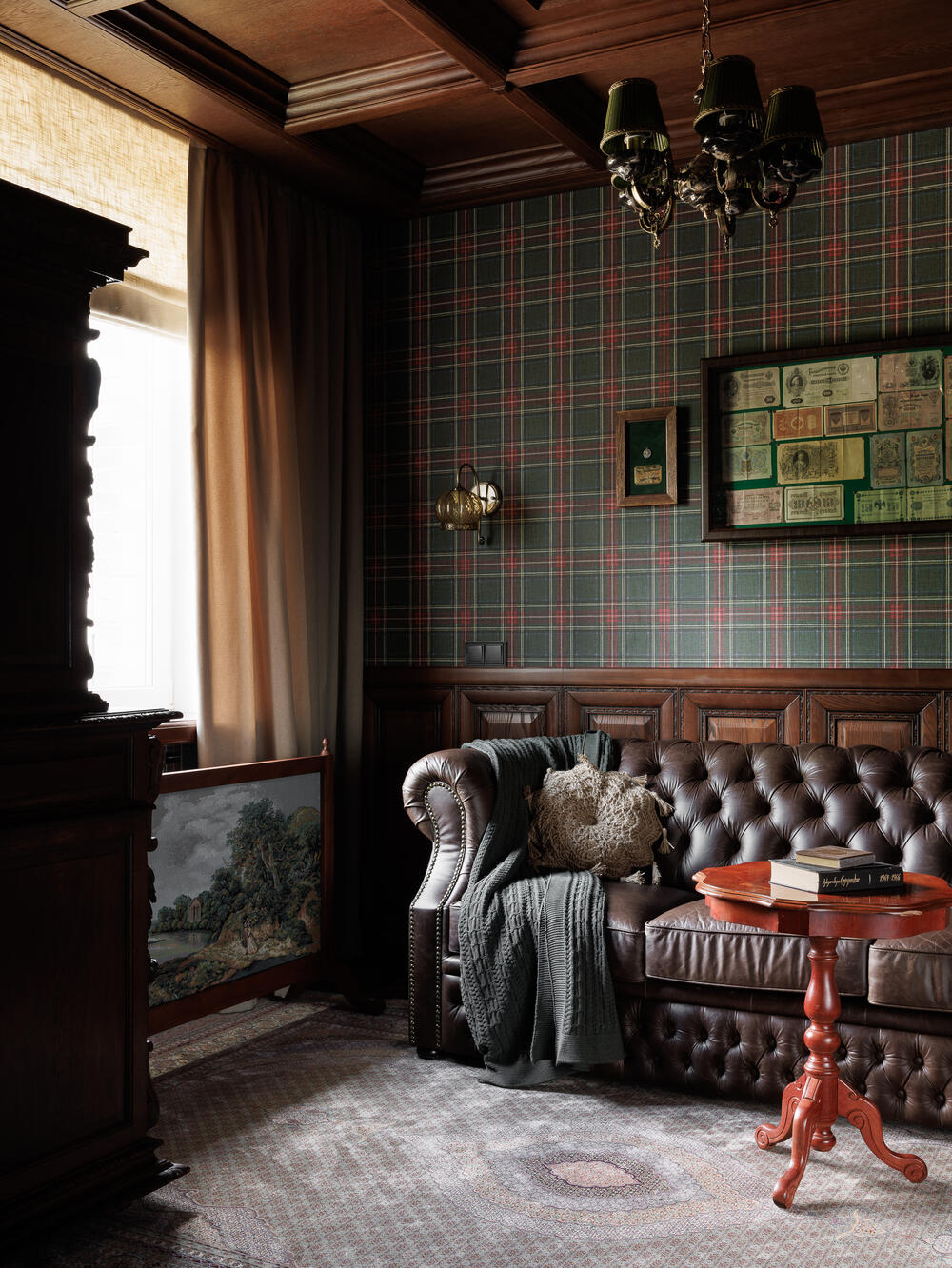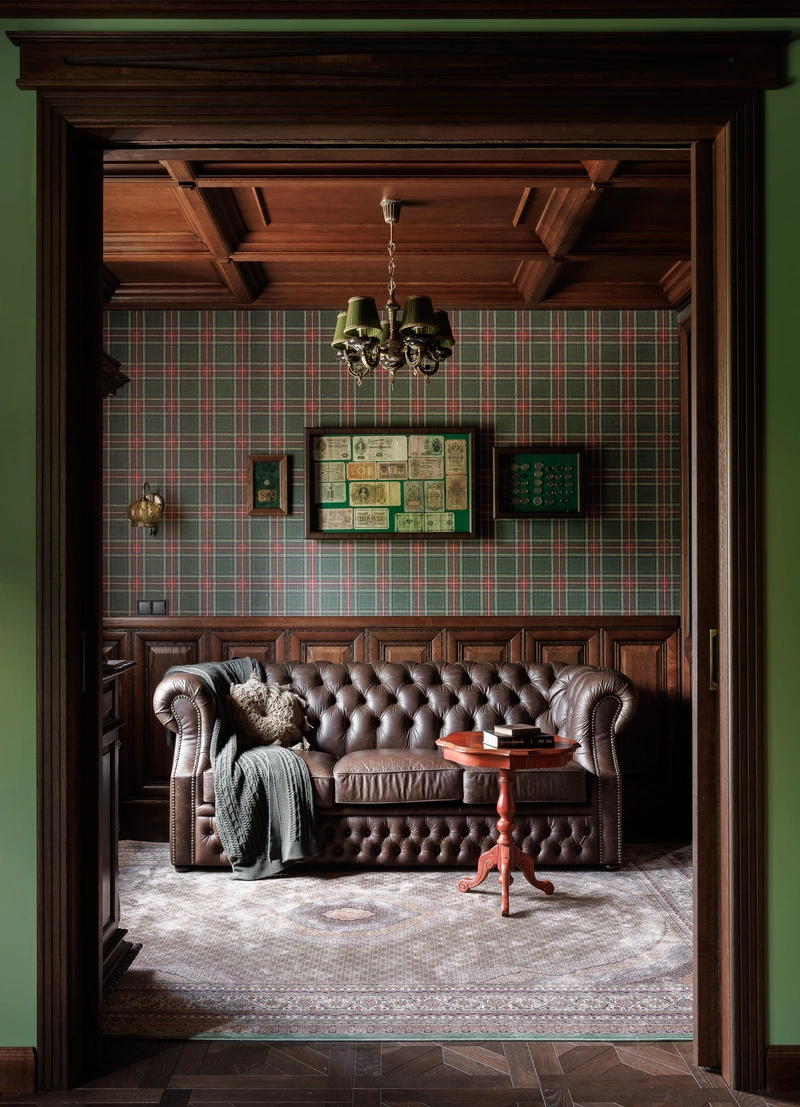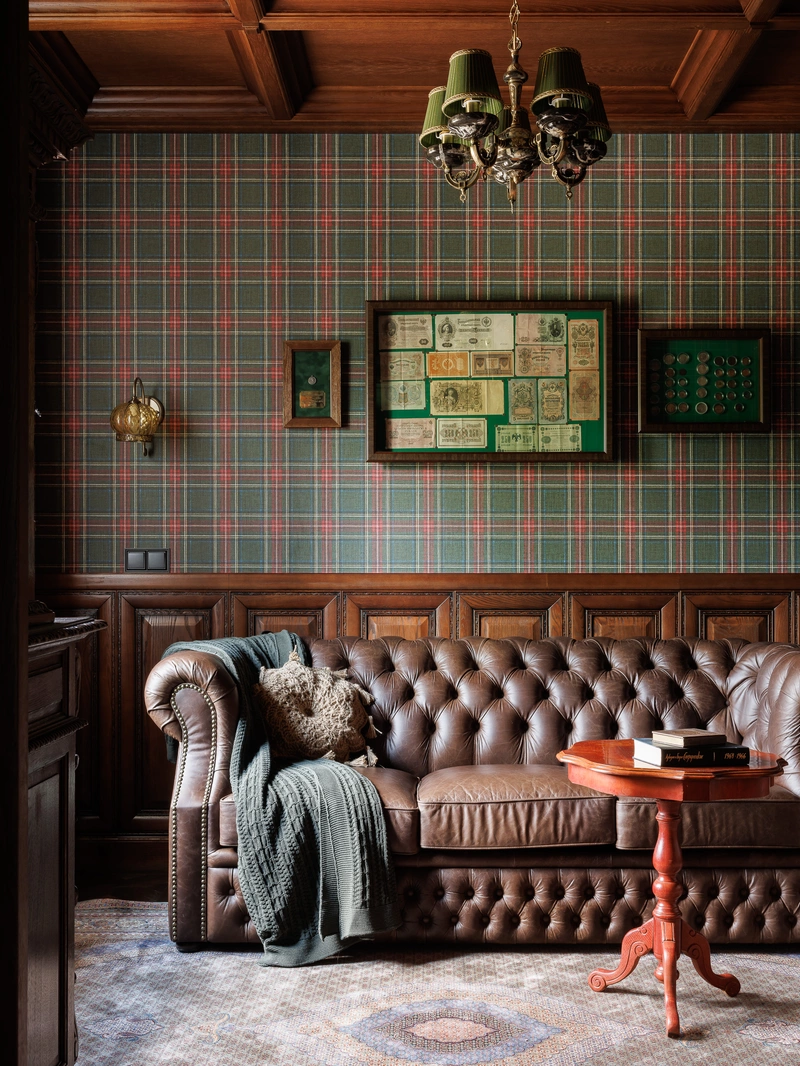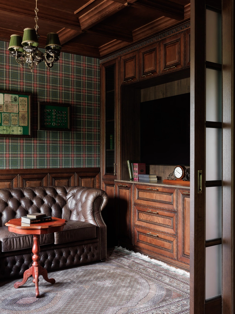 Оформление выдержано в классическом английском стиле: стены с деревянными панелями и обоями в шотландскую клетку создают атмосферу британского клуба. Массивный стол и удобный диван формируют рабочую и зону отдыха.