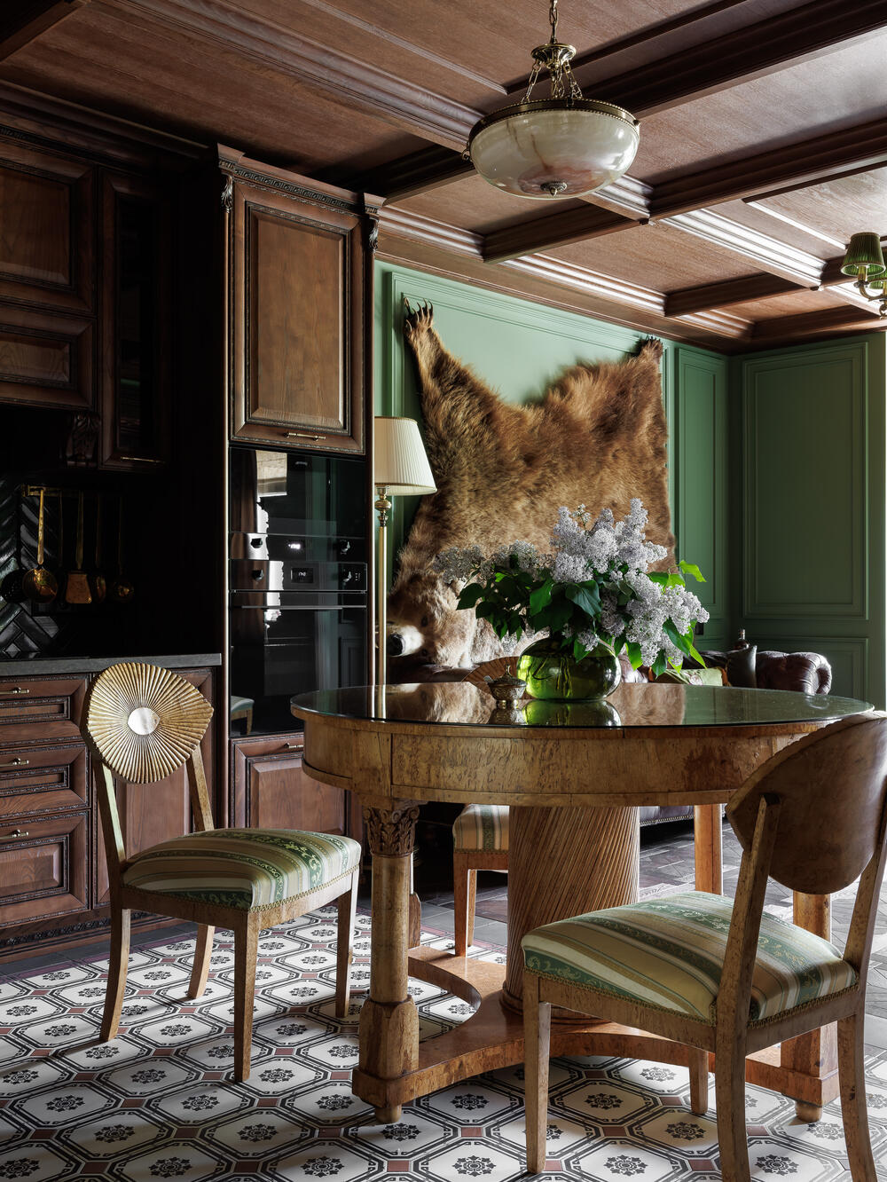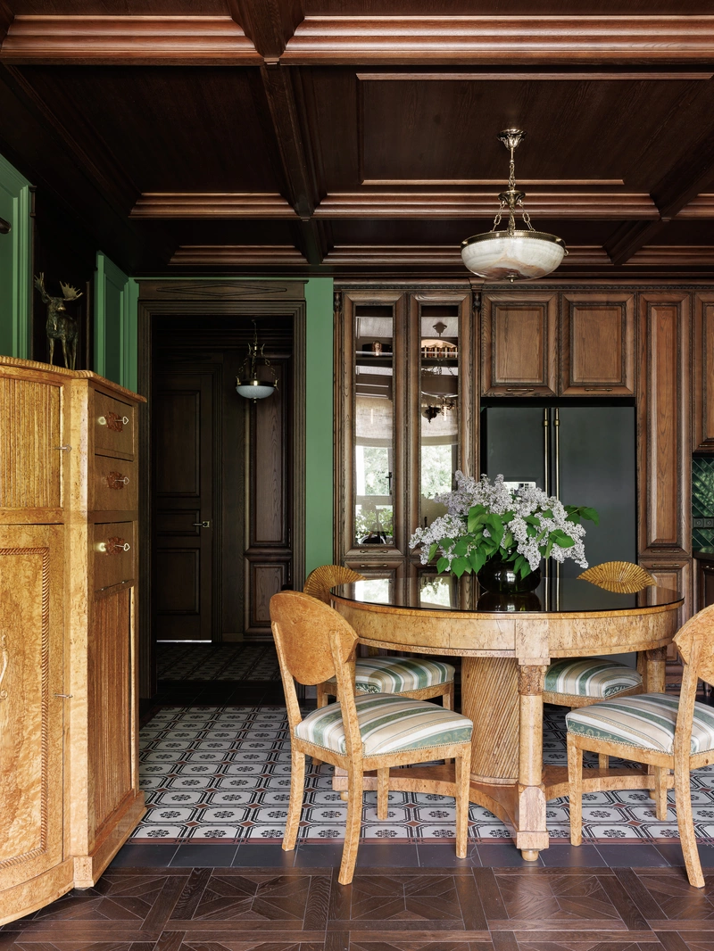 Потолок с деревянным декором и классическим графическим рисунком делает пространство более выразительным. Освещение решено традиционно: люстра и бра дают мягкий свет, создают возможность менять сценарии от яркого общего освещения до камерного.