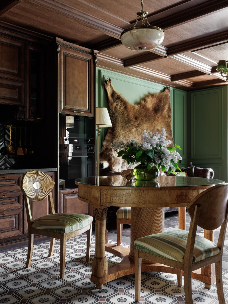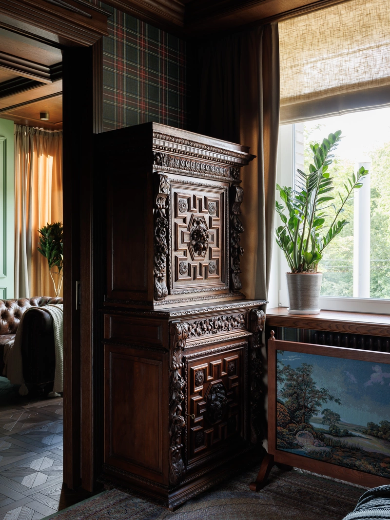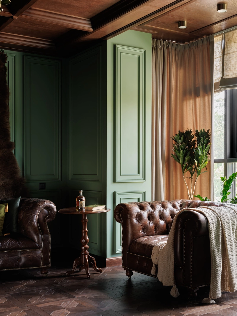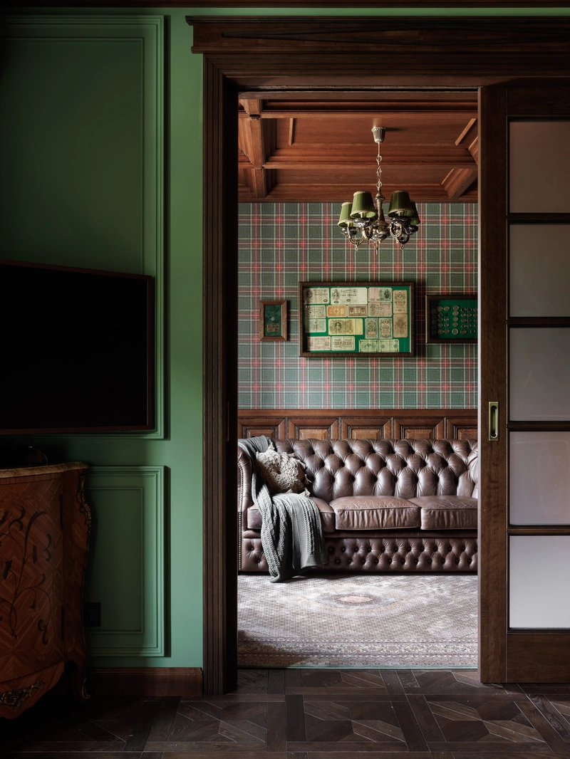 Интерьер квартиры выдержан в классическом английском стиле. Основой стали глубокие зелёные оттенки, которые в сочетании с ореховыми деревянными панелями и мебелью создают атмосферу английского дома. В гостиной и кабинете использованы обои в шотландскую клетку и декоративные молдинги — это подчёркивает выбранное направление и добавляет интерьеру характерности.