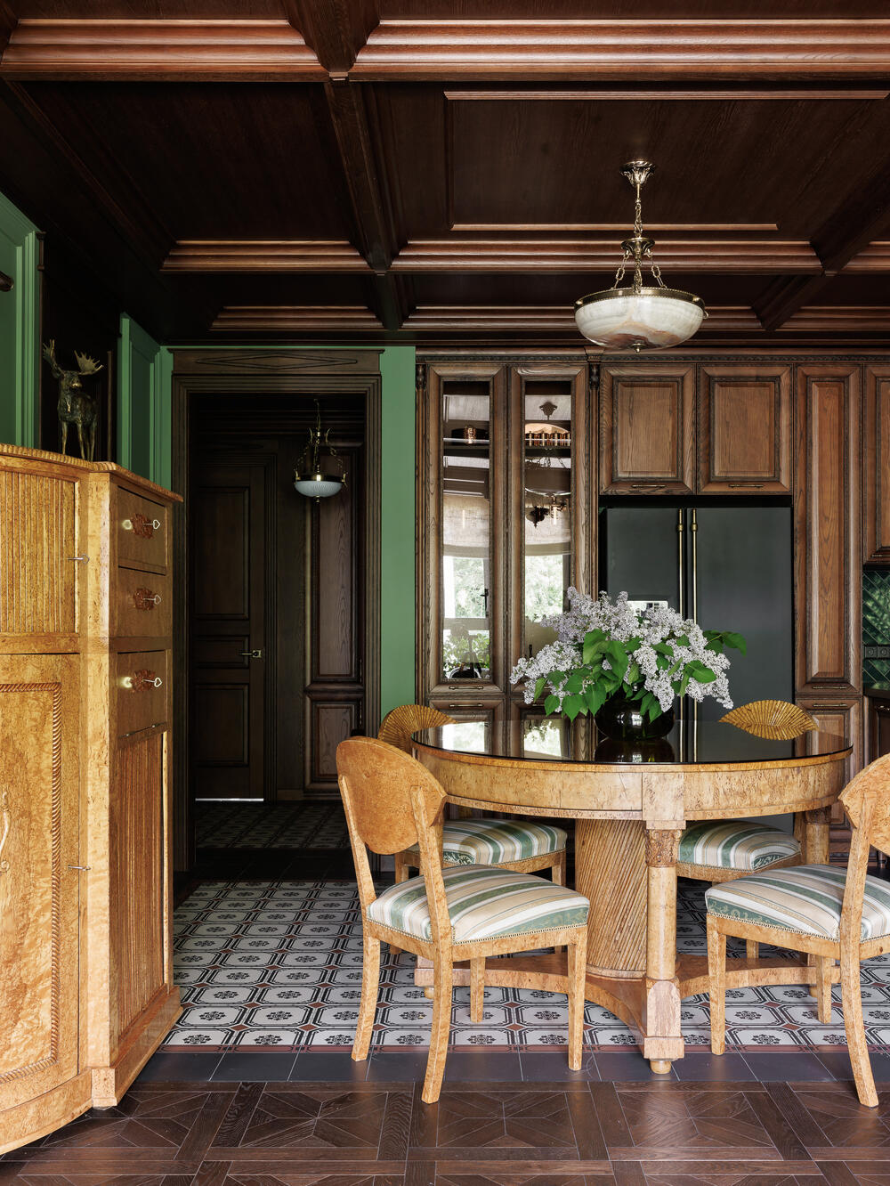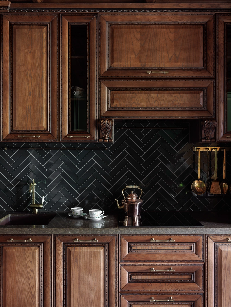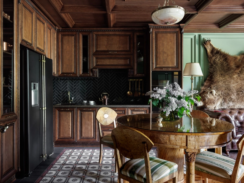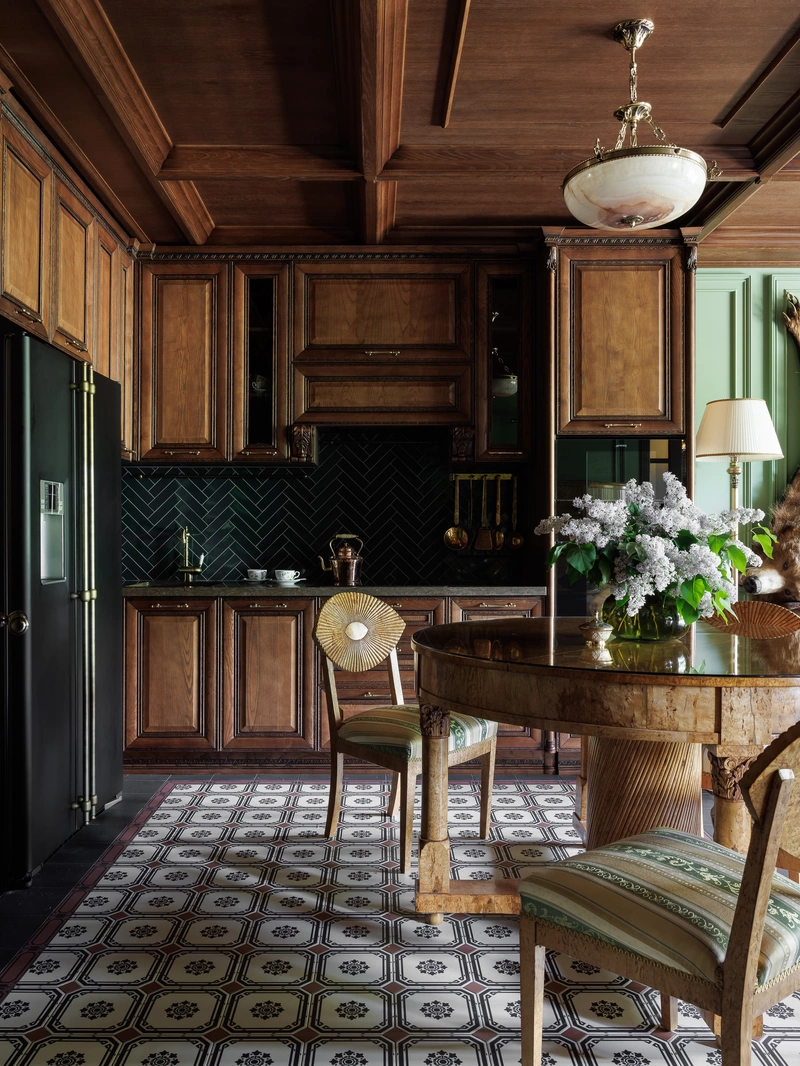 Главное пожелание заказчика — компактная, но полностью оснащенная кухня. На площади всего 3×2 м мы разместили полноценный холодильник, морозильную камеру, технику для готовки и посудомоечную машину, сохранив правильную эргономику. Кухня оформлена в классическом английском стиле: деревянные фасады, плитка с графичным орнаментом и контрастные стены насыщенного зелёного цвета.