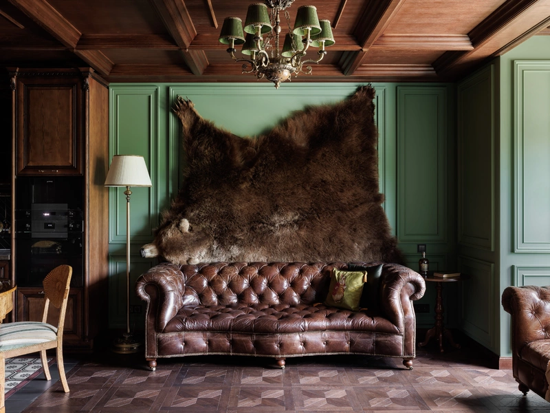 Гостиная стала центральной частью квартиры и отражает характер хозяина. Здесь разместили кожаный диван, над которым заняла своё место шкура медведя — символ увлечений заказчика охотой и путешествиями. Стены оформлены деревянными панелями и декоративными молдингами, которые подчёркивают английский стиль.