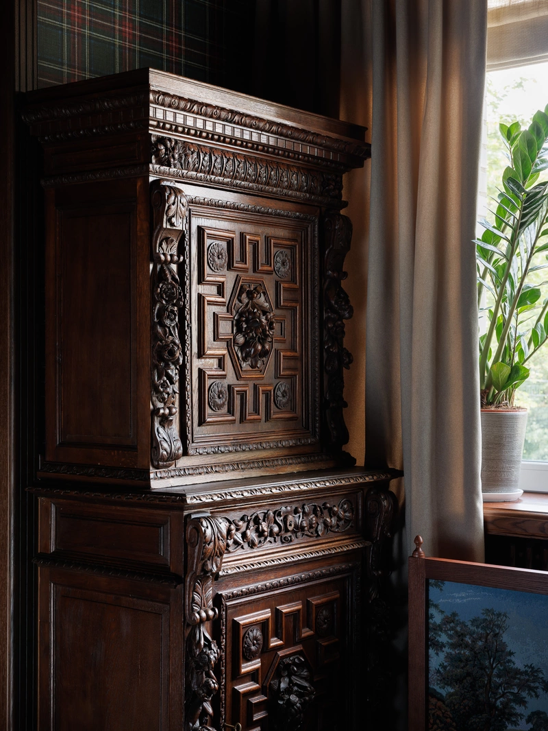 - Разместить антикварные предметы в интерьере, шкуру медведя и витрину для коллекции монет