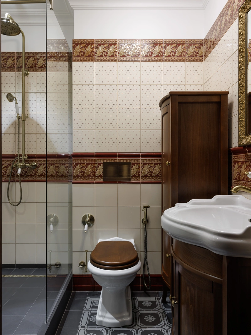 Гостевой санузел получился компактным, но очень удобным. Здесь разместили душевую кабину, унитаз и раковину с тумбой для хранения мелочей. Такое решение позволяет максимально эффективно использовать площадь. Стеклянная перегородка душа делает пространство визуально легче, а деревянная мебель и латунная фурнитура придают ему солидный вид. Благодаря продуманной планировке санузел практичен в повседневном использовании и удобен для гостей.