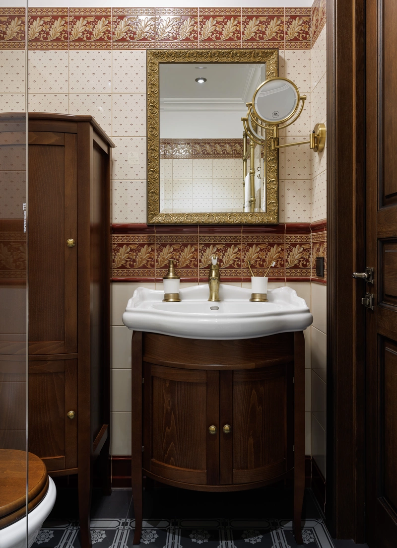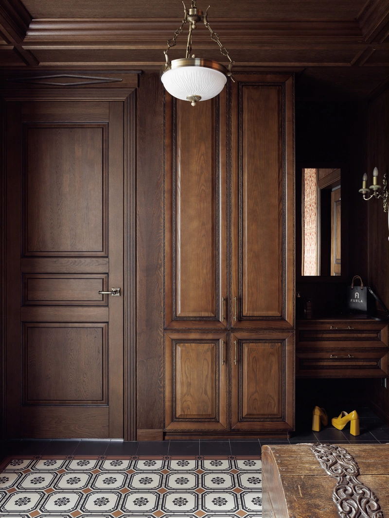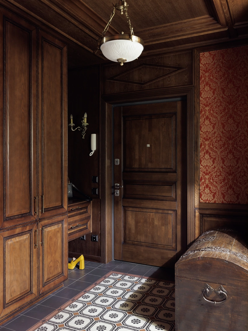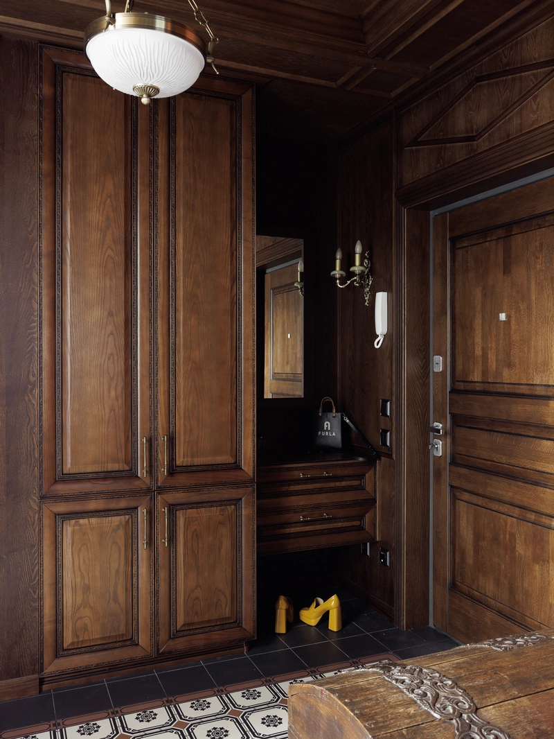 Пол выложен плиткой с графичным орнаментом — практичное решение для входной группы, которое легко поддерживать в чистоте. Декоративный деревянный потолок и бра создают атмосферу солидности уже с первых шагов в квартиру. Прихожая получилась функциональной и парадной, задавая тон всему интерьеру.